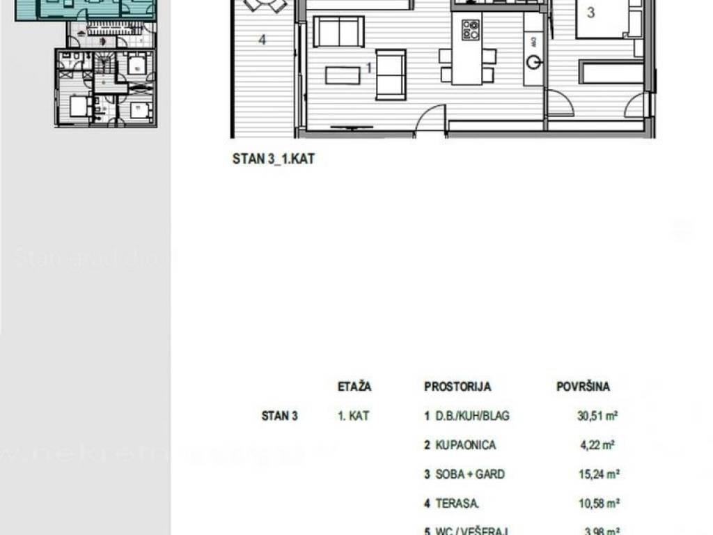 Na prodaju kod naše agencije je stavljen vrlo vrijedan i skupocjeno građen apartman na atraktivnom jadranskom turističkom području otok Krk. Ovaj apartman je smješten na odličnoj i rijetko dostupnoj lokaciji u samoj blizini mora te na pješačkoj udaljenosti od središta grada Krka i ključnih životnih sadržaja. Ovo je vrlo udobni, srednje veliki jednoetažni apartman vrlo dobrog rasporeda. U okviru moderno projektirane građevine, apartman se pruža preko prizemne etaže. Apartman obuhvaća ukupnu površinu od približno 61 m2. Tom površinom obuhvaćeni su dnevni boravak i kuhinja, 2 spavaće sobe, 1 kupaonica, 1 wc i terasa. Unutarnji prostor nekretnine je prazan i kompletno slobodan od komada namještaja. Bitno je istaknuti i da će vlasniku pripadati dio okućnice nekretnine. U vlasništvu ovog apartmana je uređen parkirni prostor za parkiranje dva automobila. Uz ranije opisane značajke ove nekretnine, istaknuli bismo i odličnu orijentaciju dopadljiv pogled apartmana prema bližoj urbaniziranoj okolici, moru i prirodnom krajobrazu. Ovaj je apartman vlasništvo fizičke osobe pa je kupac prilikom prijepisa njegovog vlasništva na svoje ime u obvezi plaćanja poreza na promet u visini 3%. Prodavatelj apartmana garantira kompletne vlasničke dokumente i uredan prijenos nekretnine. Kontaktirajte nas osobno ili telefonski, nastojat ćemo odgovoriti na sva vaša pitanja. Agencija Stan Grad Immobilien će svim svojim klijentima pružiti svu potrebnu pomoć kod uknjižbe vlasništva i preuzimanja same nekretnine. Planirani završetak radova je 2024. godine.