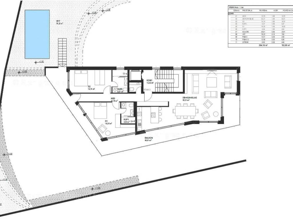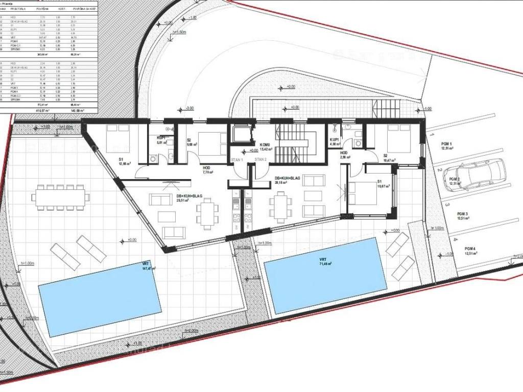 U ponudi agencije Stan Grad Immobilien nalazi se vrlo atraktivan teren za gradnju u regiji otok Krk. Parcela se nalazi na vrlo lijepoj poziciji nedaleko mora i centra mjesta Vrbnik. Ukupna površina ovog zemljišta je 965 m2. Građevinsko zemljište je kvalitetnog i kompaktnog oblika. Iznimno je pogodno za smještanje objekata s okućnicom. Uz prethodno, pozicija ovog zemljišta omogućava vrlo dobar pogled na more sa terena. Zemljište za gradnju ima odličan pristup s asfaltirane javne prometnice. Instalacije vodovoda i elektrike dovedene su pored zemljišta. Treba istaknuti da je ishodovana građevinska dozvola za gradnju objekta s 4 stambene jedinice. Predviđena je gradnja objekta s dva dvosobna stana u prizemlju; svaki s vlastitim bazenom; na prvom katu jedan dvosobni stan te u uvučenom katu također jedan dvosobni stan. Ova je nekretnina je u sustavu PDV-a, što znači da kupac nema obvezu plaćanja poreza na istaknutu cijenu. Prodavatelj zemljišta garantira kompletnu dokumentaciju za prijenos i brzu uknjižbu nekretnine na kupca. Posrednik Stan Grad Immobilien će vam asistirati u prijenosu vlasništva nekretnine.
