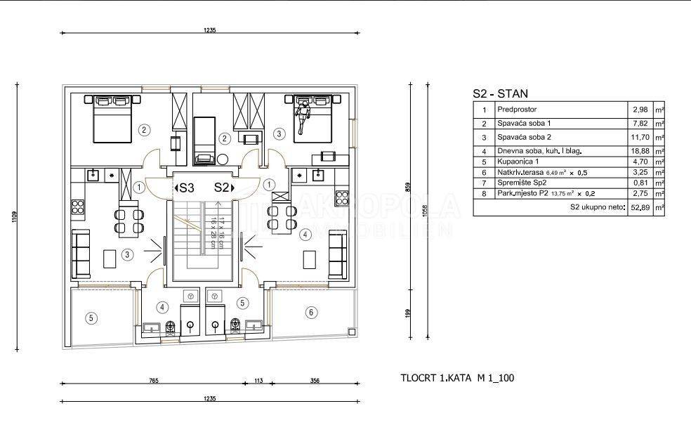 Pula, Šijana prodaje se dvosoban stan na prvome katu novo izgrađene zgrade. Zgrada je građena u skladu sa najnoviji standardima I vrhunske kvalitete gradnje. Stan se sastoji od dvije spavaće sobe, dnevnog boravka sa kuhinjom, kupaonica I velika teras ukupne kvadrature 52.89m2. Stanu također pripada jedno parkirno mjesto u zajedničkom dovorištu zgrade I ostava u prizemlju zgrade. Stan se nalazi u mirnom djelu grada I u blizini svih važnih sadržaja. Završetak gradnje I početak useljavanja je predviđen za 6. Mjesec 2026g.
