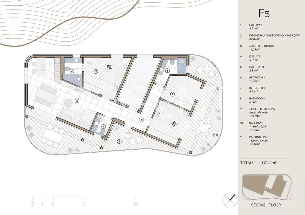 Četverosoban stan ukupne površine 117,12 m² smješten je na drugom katu suvremenog projekta VALI u Rogoznici, u mirnom dijelu mjesta nedaleko od mora. Prostran raspored, tri kupaonice i velika natkrivena terasa čine ga izvrsnim izborom za obitelji, investitore ili sve koji traže udoban i moderan dom uz more. Stan se sastoji od hodnika (8,51 m²), otvorenog dnevnog boravka s kuhinjom i blagovaonicom (32,32 m²), glavne spavaće sobe s vlastitom kupaonicom (14,08 m² + 4,61 m²), dodatnog WC-a (2,81 m²) te još dvije spavaće sobe (10,98 m² i 8,93 m²) i kupaonice (5,06 m²). Posebnu vrijednost stanu daje prostrana natkrivena terasa od 24,91 m² te dodatni balkon od 1,79 m², idealni za uživanje na otvorenom i druženje s pogledom. U cijenu je uključeno i parkirno mjesto površine 3,12 m². Interijer je dizajniran s naglaskom na svjetlost i prozračnost, uz kvalitetne materijale i moderne završne detalje. Velike staklene stijene povezuju interijer s vanjskim prostorom, stvarajući sklad između unutarnjeg komfora i mediteranskog ugođaja. Projekt VALI nalazi se u mirnom dijelu Rogoznice, svega nekoliko minuta hoda od mora, trgovina i restorana. Lokacija je odlično povezana sa Šibenikom i Splitom, što osigurava jednostavan pristup svim važnim sadržajima i prometnim čvorištima. Uz to, okruženje je uređeno i ugodno, pa sve svakodnevne potrebe možete obaviti u neposrednoj blizini bez gužve i buke. Zgrada je izgrađena prema visokim standardima energetske učinkovitosti i suvremenog dizajna. Stanovi su dostupni u prodaji, a završetak radova odvija se u skladu s planiranom dinamikom projekta. Za više informacija, slobodno nas kontaktirajte.