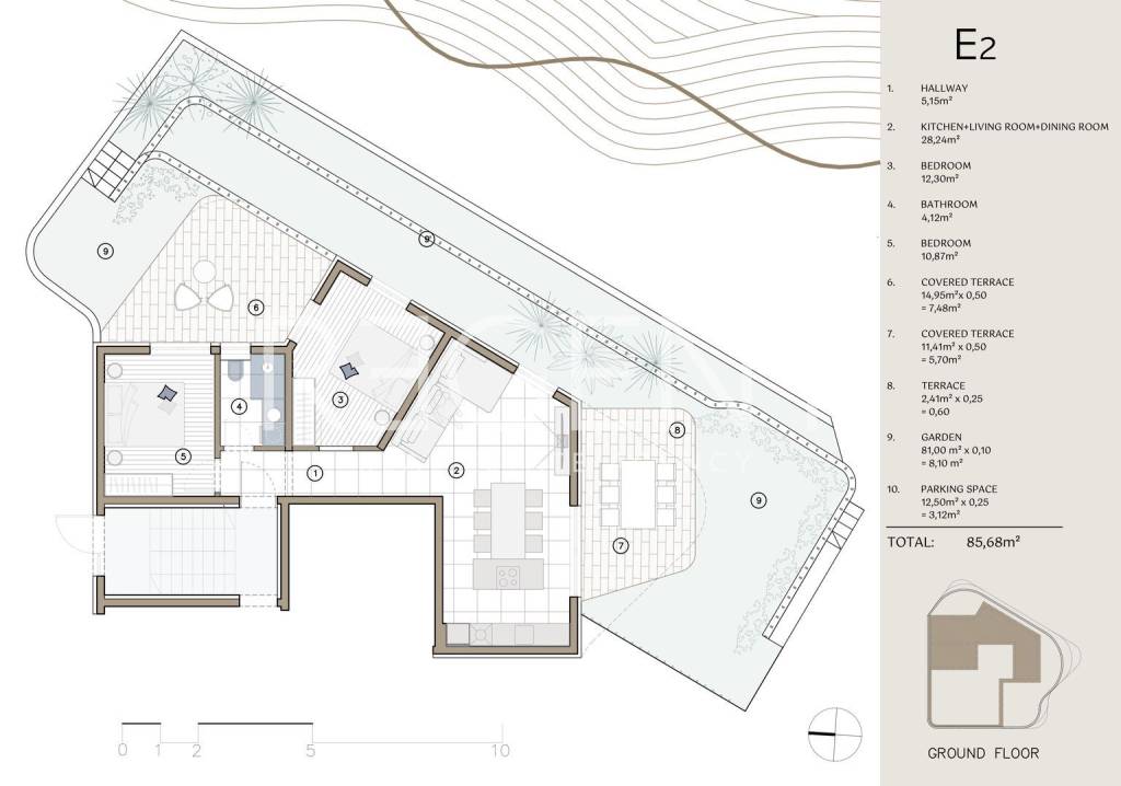 Trosoban stan ukupne površine 85,68 m² smješten je u prizemlju ekskluzivnog projekta VALI u Rogoznici, u mirnom dijelu mjesta u neposrednoj blizini mora. Zbog prostranog vrta i otvorenog rasporeda prostorija, idealan je za obitelji, parove ili kao investicija za turistički najam. Stan se sastoji od hodnika (5,15 m²), dnevnog boravka s kuhinjom i blagovaonicom (28,24 m²), dvije spavaće sobe (12,30 m² i 10,87 m²) te kupaonice (4,12 m²). Posebnu vrijednost prostoru daju dvije natkrivene terase (7,48 m² i 5,70 m²), otvorena terasa od 0,60 m² te privatni vrt površine 8,10 m² – savršen za boravak na otvorenom i uživanje u mediteranskom ugođaju. U cijenu je uključeno i vanjsko parkirno mjesto površine 3,12 m². Projekt VALI nalazi se u mirnom dijelu Rogoznice, svega nekoliko minuta od mora, trgovina, restorana i marine. Odlična prometna povezanost omogućuje brz dolazak do Šibenika i Splita, što ovu lokaciju čini praktičnom i atraktivnom za život i odmor. Uz to, okruženje je uređeno i ugodno, pa sve svakodnevne potrebe možete obaviti u neposrednoj blizini bez gužve i buke. Interijer je pažljivo oblikovan kako bi pružio maksimalnu udobnost, prozračnost i funkcionalnost. Velike staklene stijene povezuju unutarnji i vanjski prostor, dok su korišteni materijali visoke kvalitete u skladu s modernim standardima gradnje. Zgrada je projektirana prema suvremenim standardima energetske učinkovitosti i kvalitete gradnje. Stanovi su dostupni u prodaji, a završetak radova odvija se prema planiranoj dinamici. Za više informacija, slobodno nas kontaktirajte.