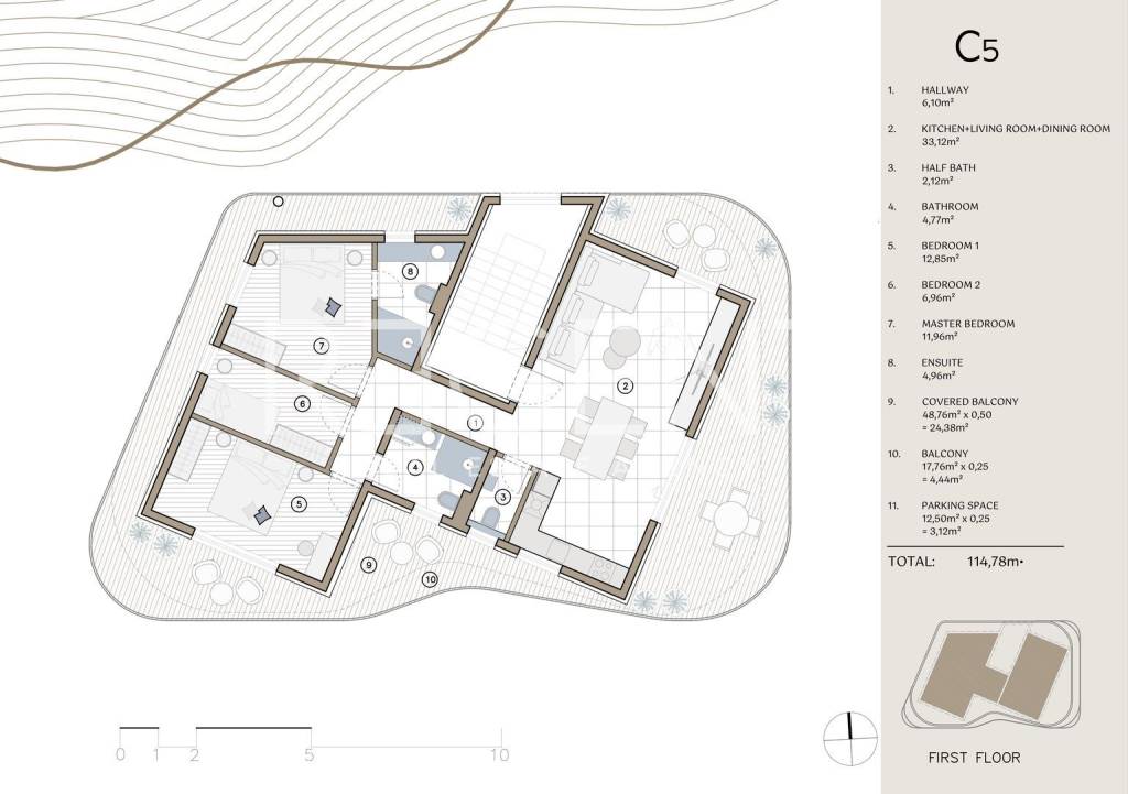Četverosoban stan ukupne površine 114,78 m² smješten je na prvom katu ekskluzivnog projekta VALI u Rogoznici, u mirnom dijelu mjesta nadomak mora. Zbog prostranog rasporeda i dva balkona, idealan je za obitelji ili kao investicija za turistički najam, pružajući spoj suvremenog dizajna i ugodnog mediteranskog okruženja. Stan se sastoji od hodnika (6,10 m²), otvorenog dnevnog boravka s kuhinjom i blagovaonicom (33,12 m²), tri spavaće sobe (12,85 m², 6,96 m² i 11,96 m²), dvije kupaonice (4,77 m² i 4,96 m²) te dodatnog WC-a (2,12 m²). Specifična za ovaj stan dva su balkona – natkriveni površine 24,38 m² i nenatkriveni od 4,44 m², idealni za opuštanje i uživanje na otvorenom. U cijenu je uključeno i vanjsko parkirno mjesto površine 3,12 m². Projekt VALI nalazi se u mirnom dijelu Rogoznice, svega nekoliko minuta od mora, trgovina, restorana i marine. Odlična prometna povezanost omogućuje brz dolazak do Šibenika i Splita, što ovu lokaciju čini praktičnom i atraktivnom za život i odmor. Uz to, okruženje je uređeno i ugodno, pa sve svakodnevne potrebe možete obaviti u neposrednoj blizini bez gužve i buke. Interijer je promišljeno oblikovan s naglaskom na funkcionalnost i udobnost. Velike staklene stijene propuštaju obilje prirodnog svjetla, dok kvalitetni materijali i završna obrada osiguravaju dugotrajnost i eleganciju prostora. Zgrada je modernog dizajna, s naglaskom na energetsku učinkovitost i visoku kvalitetu gradnje. Za više informacija, slobodno nas kontaktirajte.