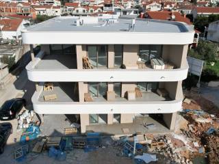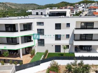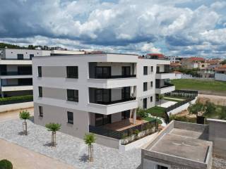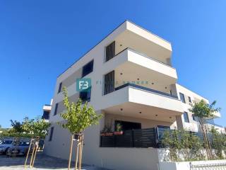 € 355.000Četverosobni stan Vodice, VodiceVODICE - Prodaje se luksuzni stan s 3 spavaće sobe na 1. katu s pogledom na more, udaljen samo 400 m od plaže i novouređene šetnice uz more te 900 m od centra! Nova stambena zgrada sa ukupno 6 stanova, nalazi se na izvrsnoj lokaciji. Ima ukupno 3 etaže: prizemlje + 1. kat + 2. kat. Zgrada modernog izgleda građena je kvalitetnim materijalima prema posljednjim standardima gradnje i opremljena: PVC stolarija s komarnicima, staklena ograda, stiropor fasada, rolete s električnim podizačima, podno grijanje, protuprovalna ulazna vrata, visoko kvalitetne keramičke obloge, moderne sanitarije u kupaoni