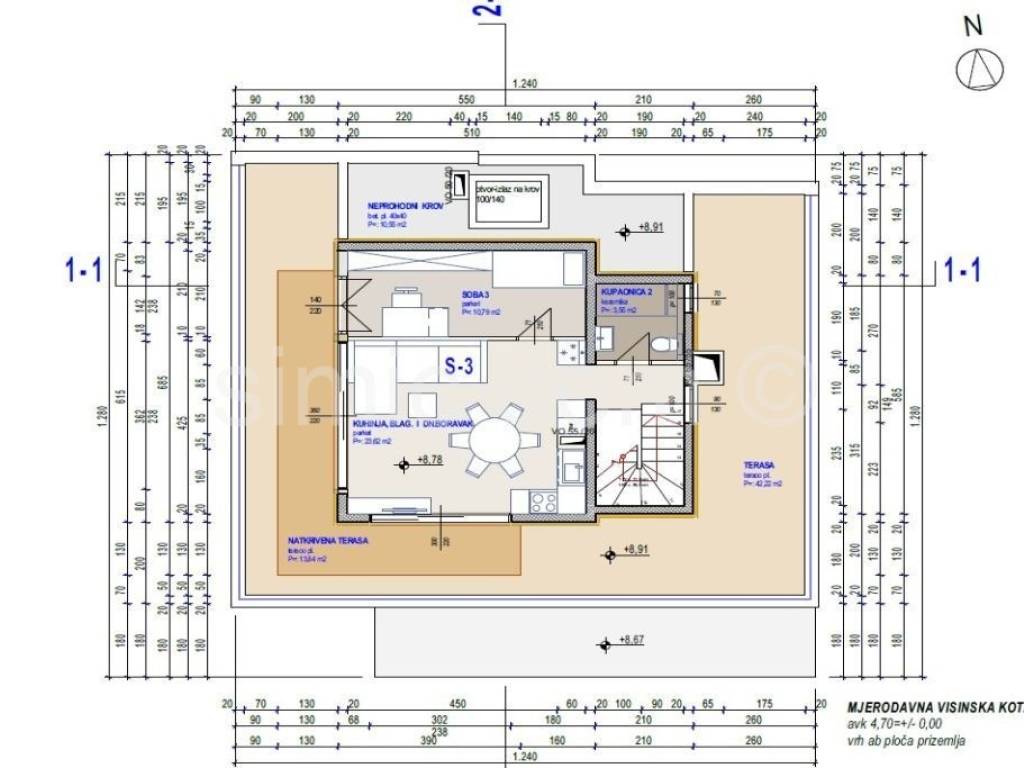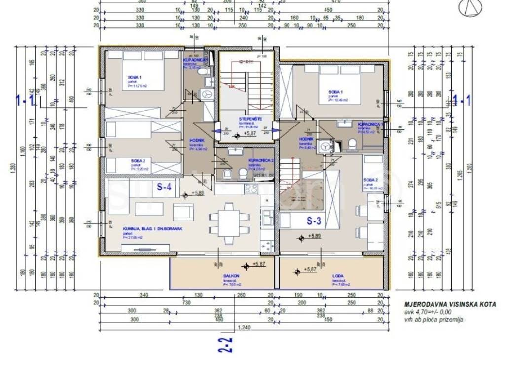 Apartments for sale in an extremely attractive location close to all amenities in Kastela. The building is 350m from the beach, in a quiet street and is close to all other necessary amenities such as shops, pharmacies, cafes and schools. The building is being built by a reputable company with extensive experience in new buildings, so buyers are exempt from real estate tax, and there is the possibility of purchasing on credit. Apartment S3 is a two-story apartment and is placed on the second floor and extends to the third floor of the building. It has an internal area of 80.39 m2 and another 63.71 m2 of terrace and loggia, and it has a garage and covered parking space. Together with all the belongings, the property has a net usable area of 121 m2. On the lower floor there is a hallway, two bedrooms, a bathroom and a loggia. The upper floor consists of a hallway, bathroom, kitchen with dining room and living room with access to a terrace with a sea view. Each apartment is equipped with care according to high construction standards. In terms of equipment, renowned manufacturers have been selected that guarantee durability, functionality and aesthetics, underfloor heating in bathrooms, double-glazed windows with gas filling, ceramic floors up to 25 or parquet up to 40. Expected move-in is summer 2026.