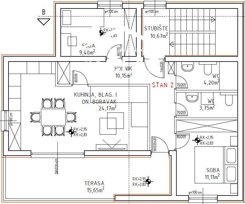 stan + veći dio terase – ukupno 110,60 m2 a obračunato 80,60 m2, cijena 265.980,00 €