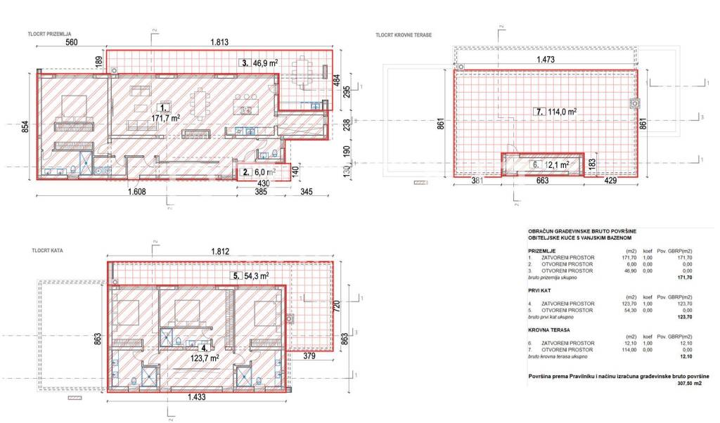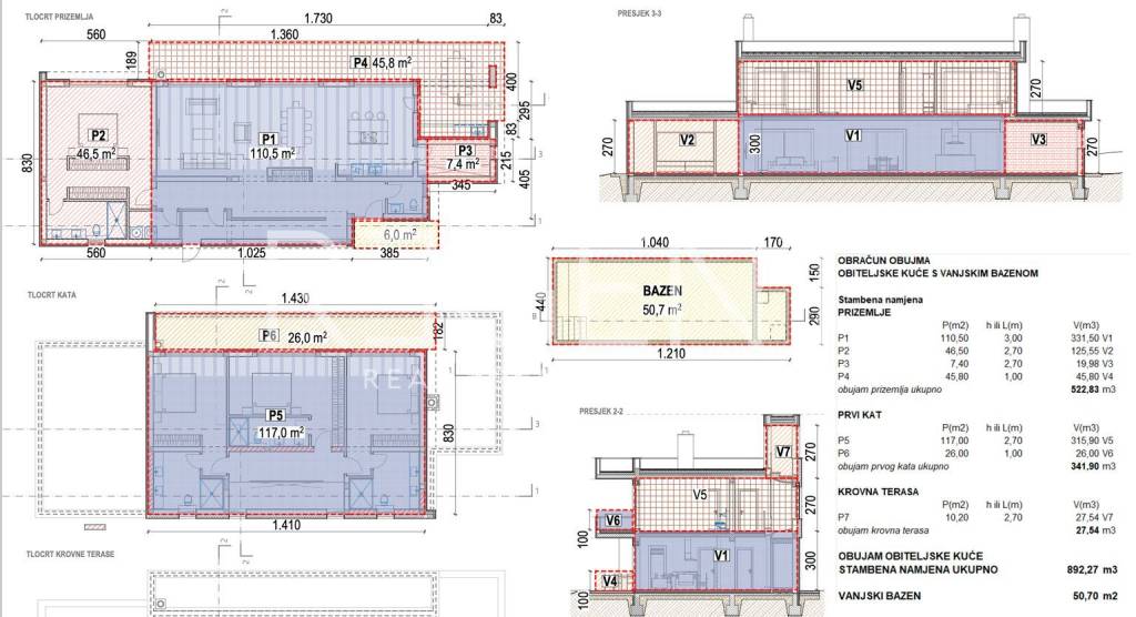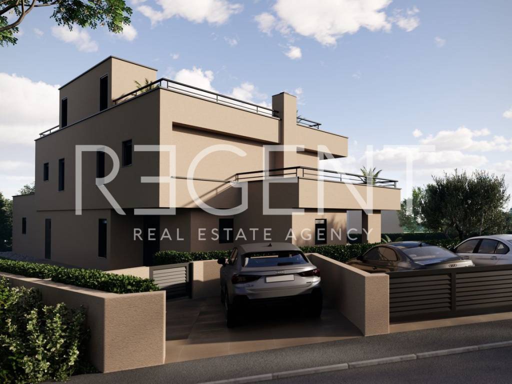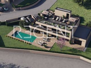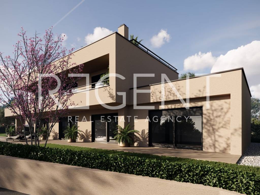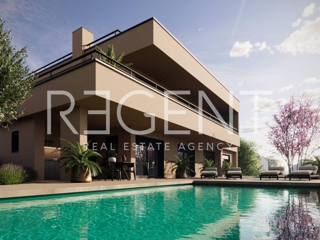 The modern villa is located in a quiet area of Poreč, about 14 kilometers from the sea. It extends over the ground floor, first floor and roof terrace and is ideal for families and investors looking for quality, comfort and privacy. The total living area is 239.2 m², while the total net area including open areas is 433.7 m². On the ground floor there is an entrance hall, toilet, dining room, kitchen, pantry, living room, bedroom, bathroom, utility room and engine room, as well as a covered entrance and covered terrace. On the first floor there is a hallway, three bedrooms, two bathrooms and a staircase, as well as a covered terrace and an uncovered terrace. The roof terrace offers a spacious open space for relaxation and outdoor living. A swimming pool with an area of 50.7 m² further complements the content of the property. The villa is located in a quiet environment, and all the amenities that Poreč and the surrounding area offer are nearby. The sea, shops, restaurants and everyday needs are easily accessible, which makes the location suitable for living, vacation or tourist rental. For additional information, feel free to contact us.