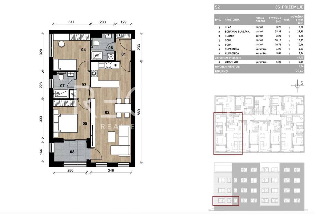 A three-room apartment located on the ground floor of a new building in the quiet Kramarići Street. It is ideal for families looking for a comfortable and functional home with easy access to all amenities and greenery in the surrounding area. The apartment has a total net area of 70.69 m² and consists of an entrance area, an open space living room with a dining area and kitchen, a hallway, two bedrooms and two bathrooms. The living area opens onto a winter garden, which gives the space additional warmth and natural light. The interior features solid oak parquet floors, while the bathrooms are covered with first-class ceramics. The apartment has wood-aluminum joinery with triple-layer glass, security doors, video intercom, radiators with thermostatic valves, a Vaillant condensing gas boiler and air conditioning. The building is located in a quiet residential street in the Dugave neighborhood, with quick transport connections to the main city routes and the bypass. Shops, schools, kindergartens and public transport are in the immediate vicinity, making this location extremely practical for everyday life. The building has a modern design, with 22 residential units spread over four floors, energy class A+. It is equipped with an elevator, a common garage space and outdoor parking spaces, while the surroundings are horticulturally landscaped. The purchase of a garage or outdoor parking space and a storage room is mandatory with each apartment. The selling price is 4,490.00 EUR/m². Storage rooms and garage parking spaces are sold separately at a price of 2,245.00 EUR/m², while the price of an outdoor parking space is 1,122.50 EUR/m². For more information, feel free to contact us.