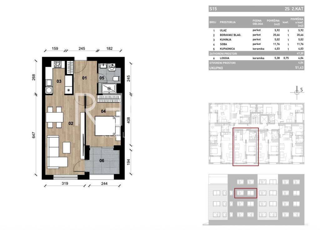 The two-room apartment is located on the second floor of a modern new building in Kramarići Street. This functional and bright apartment is an excellent choice for couples or individuals looking for a quality home in a quiet environment, while still being close to all city amenities. The apartment has a total net area of 51.43 m² and consists of an entrance area, living room with dining area, kitchen, bedroom, and bathroom. The living area opens onto a loggia, ideal for relaxing during the warmer months. The flooring is made of oak parquet, while first-class ceramic tiles are installed in the bathroom and on the loggia. The apartment is equipped with wood-aluminum joinery with triple-layer glass, anti-theft doors, a video intercom, a Vaillant condensing gas boiler, radiators with thermostatic valves, and air conditioning. The building is located in a quiet part of Jakuševec, near shops, schools, kindergartens, and public transport, with excellent connections to the center of Zagreb. Kramarići Street provides a peaceful and pleasant environment, which makes this apartment ideal for living or investment. The modernly designed building has 22 residential units, an elevator, a common garage, and outdoor parking spaces, and the environment is horticulturally landscaped. It is energy class A+ and built according to high standards of thermal and sound insulation. The purchase of a garage or outdoor parking space is mandatory with each apartment. The selling price is 4,490.00 EUR/m². Storage rooms and garage parking spaces are sold separately at a price of 2,245.00 EUR/m², while the price of an outdoor parking space is 1,122.50 EUR/m². For more information, feel free to contact us.