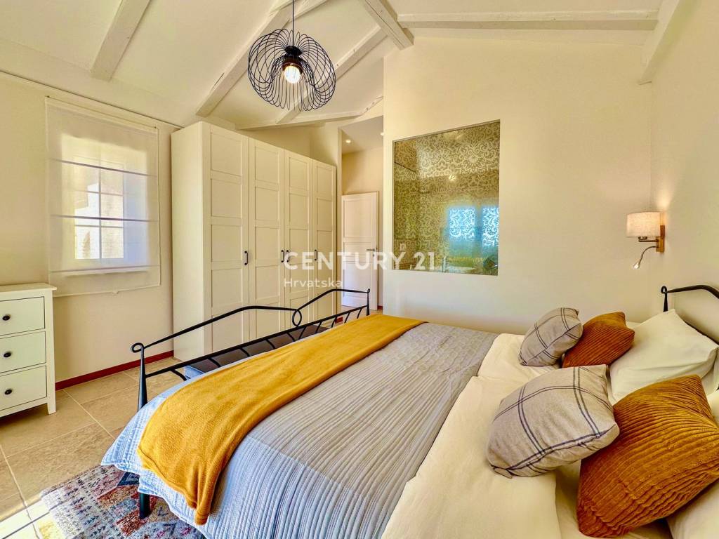 The house impresses with its unique Mediterranean style, warm materials, and many thoughtful details that give it a special charm. Upon entering, you immediately feel the harmony of stone, wood, brick, and traditional elements such as old roof tiles, which have been used as decoration above the new roof.