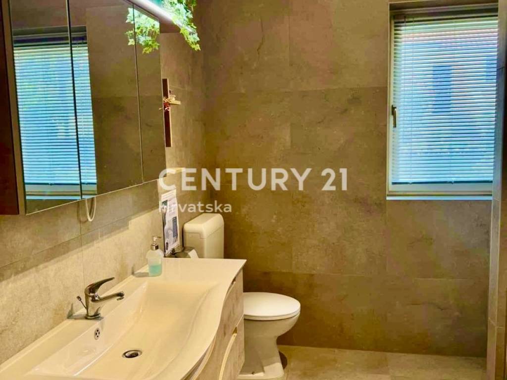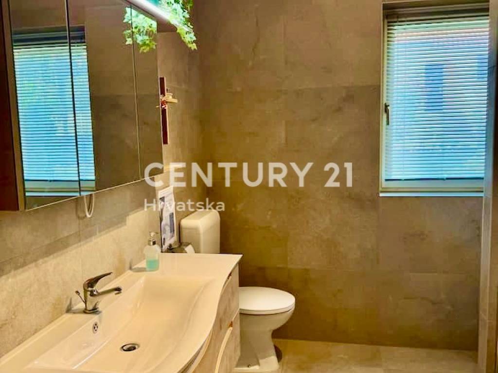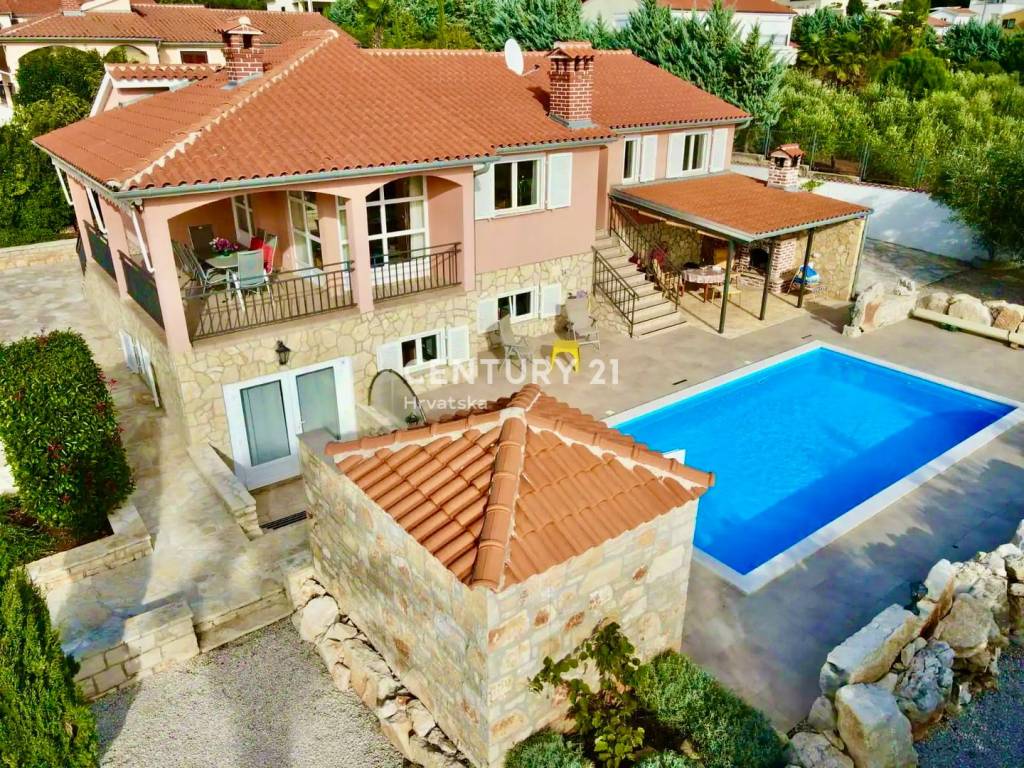Outside, you will find a 32 m2 swimming pool with an outdoor shower, a separate room for pool equipment, ample parking spaces, seven olive trees, and a covered summer kitchen with a fireplace – perfect for enjoying mild summer evenings.