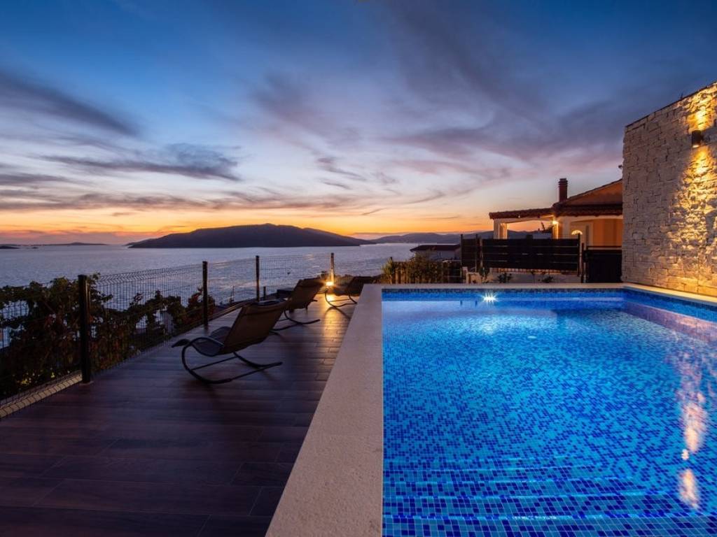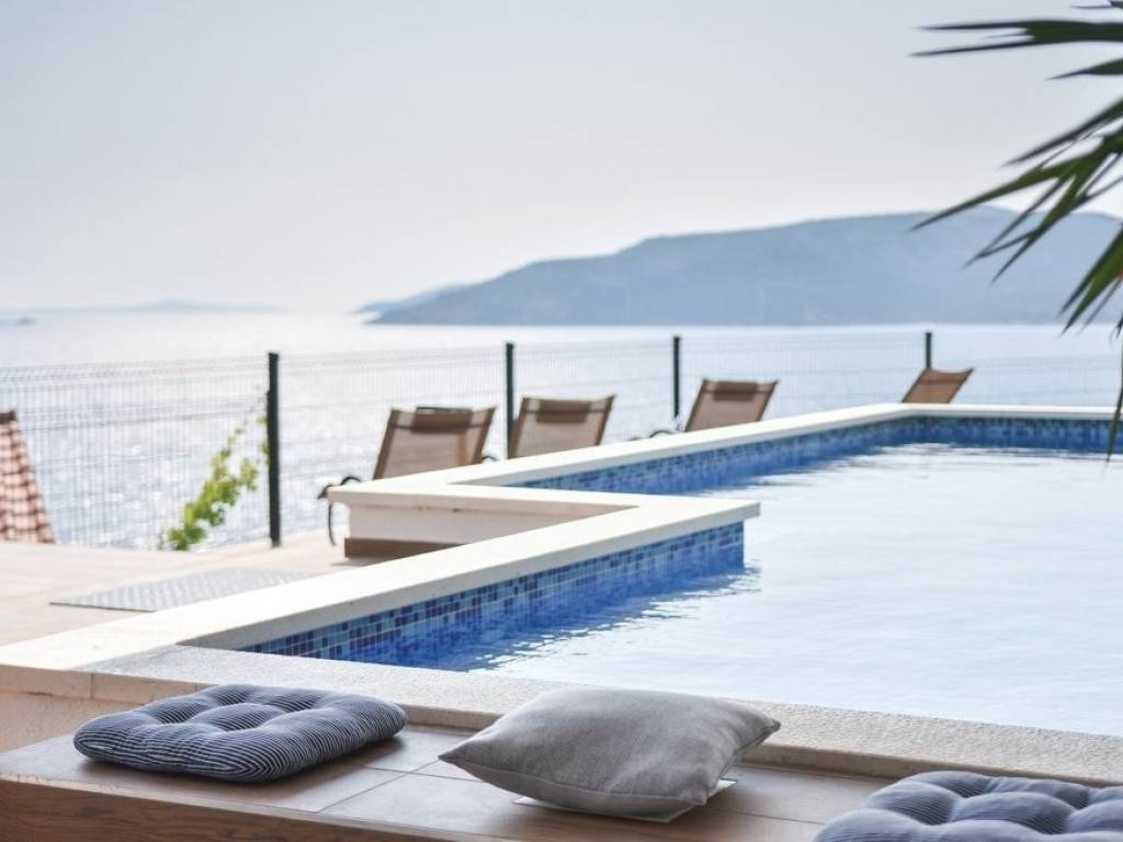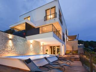 Villa on the island of Ciovo for sale. Only 80 meters from the sea, raised above a small and quiet village on a plot of 552 m2, offers a beautiful open panoramic view of the sea and islands. Given its location, it provides a dose of intimacy and is ideal for relaxation and rest. The total living area is 252 m2 spread over three floors. The first floor is reserved for relaxation facilities such as sauna, jacuzzi for three people and a large outdoor heated pool of 33 m2. On the second floor there is a large living room with glass walls through a beautiful sea view, large kitchen with dining table , one restroom, and one room with bathroom. The dining room has access to a beautiful outdoor terrace. On the third floor there are four bedrooms, each with its own bathroom. The villa was built and completed in 2018. Distance from Trogir 8 km, while the distance from Resnik Airport is only 9 km.