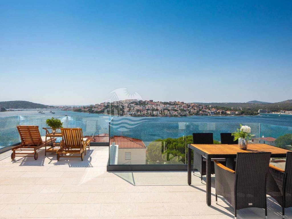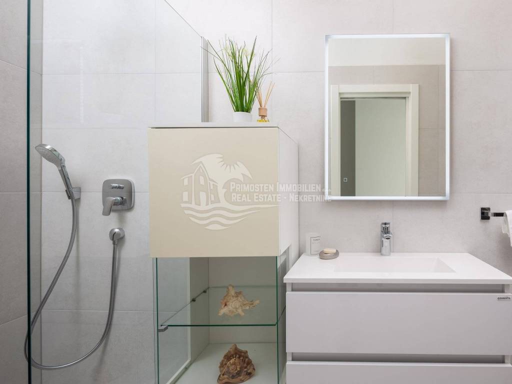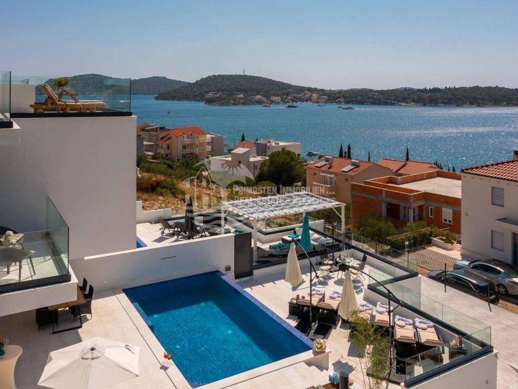 A villa near Rogoznica, a luxurious pearl of modern architecture. The house is part of a duplex complex (the left side of the picture refers to the building), has an area of 300 m², and was built on a plot of 488 m². Glazed and illuminated, modernly decorated with an elegant interior, the villa is an exclusive magnificent building. An impressive representative view of the bay and the illuminated city crown the location where the villa is located. The house consists of a souterrain, ground floor and two floors. On the ground floor there is a spacious living room with a kitchen and a dining room, and from the living room there is a spacious furnished terrace with a heated pool. On the ground floor there are also two additional storage rooms, a laundry room and a separate toilet. Floor heating is also fully installed on this floor. The staircase leads to the first floor, where there are three bedrooms with their own bathrooms. One bedroom has a separate area with a TV set and a couch set, as well as a separate access and an external staircase that can be used to get to that area. There is another laundry room on this floor. Both rooms have underfloor heating in the bathrooms. The rooms also have access to the terrace with a view of the sea. Furthermore, an internal staircase leads to the last floor, which serves as a separate residential unit and consists of a living room, kitchen, bedroom and bathroom. The living room leads to the outdoor terrace, which has a fantastic view of Rogoznica and the sea. There is also a fireplace in the living room. Also on the last floor, underfloor heating is installed in all rooms. All rooms have mosquito nets, electric blinds, and the villa is superbly equipped according to the latest standards. All rooms are air-conditioned, and the kitchens are equipped with top-quality appliances. In the complex there is a heated swimming pool measuring 7x4 with a heat pump, an outdoor grill with outdoor furniture, and a staircase leads to the souterrain, where there is a garage of approx. 20 m² with a boiler room. The facility has a total of five parking spaces. There are also solar collectors on the roof. The villa already has an established rental business and excellent seasonal occupancy. The location where the property is located is a charming little place next to Rogoznica that has seen significant tourist growth in the past few years. The villa is 100 m from the sea and 35 km from Split airport.