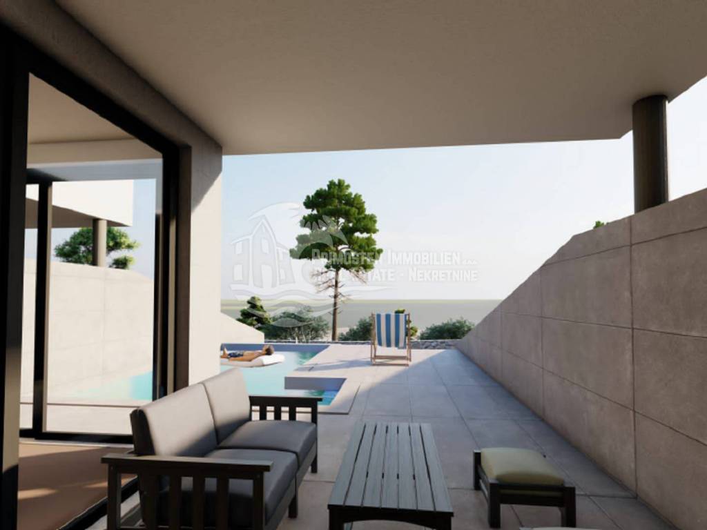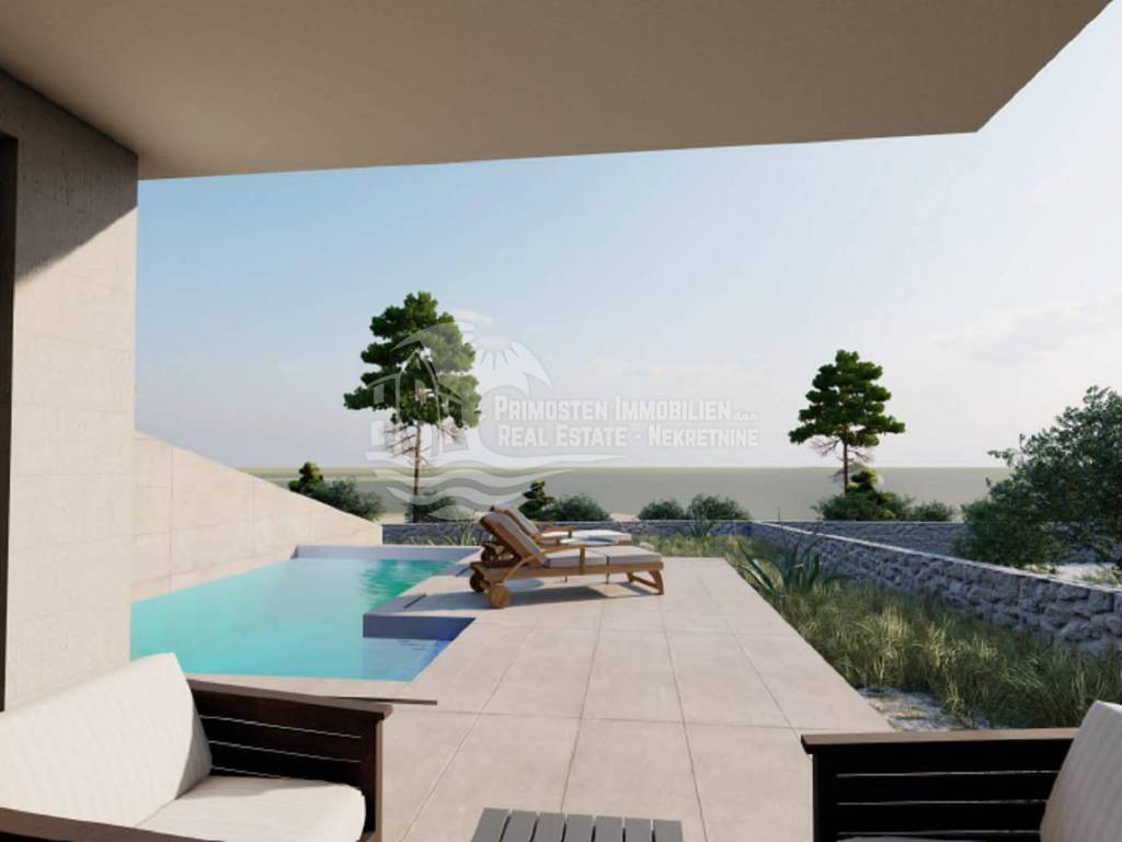 We are mediating the sale of a luxury triplex S1 located in Primošten in an excellent location. The total living area is 107.7 m2. This newly built modern villa consists of two floors. On the first floor, there is a kitchen with a dining room, a spacious living room, a study, and a bathroom. An internal staircase leads to the first floor where there are two bedrooms, two bathrooms, and a balcony that has an exit from two bedrooms. From the balcony, there is a beautiful view of the sea and Primošten. In front of the villa there is a swimming pool with a sunbathing area, which is ideal for relaxing and enjoying the outdoors, as well as a space for socializing. Planned completion of construction in 2025. This villa offers complete luxury, privacy and, a beautiful view of the sea. Extremely high-quality materials were used in the construction, including aluminum joinery, and underfloor heating was installed throughout the ground floor and in the bathrooms.