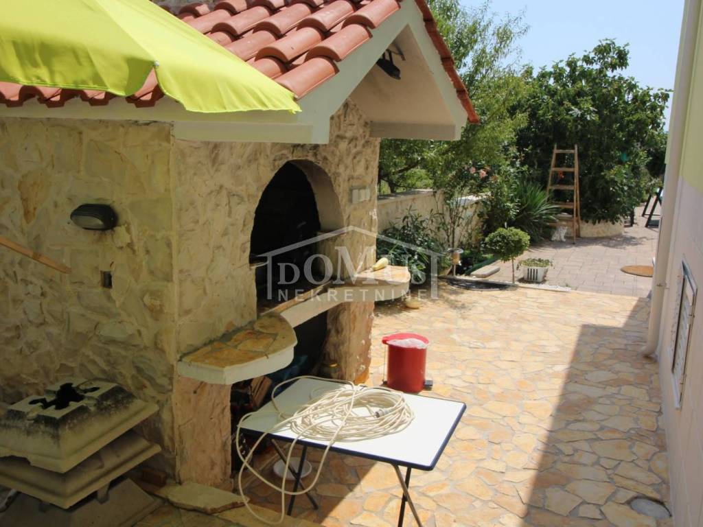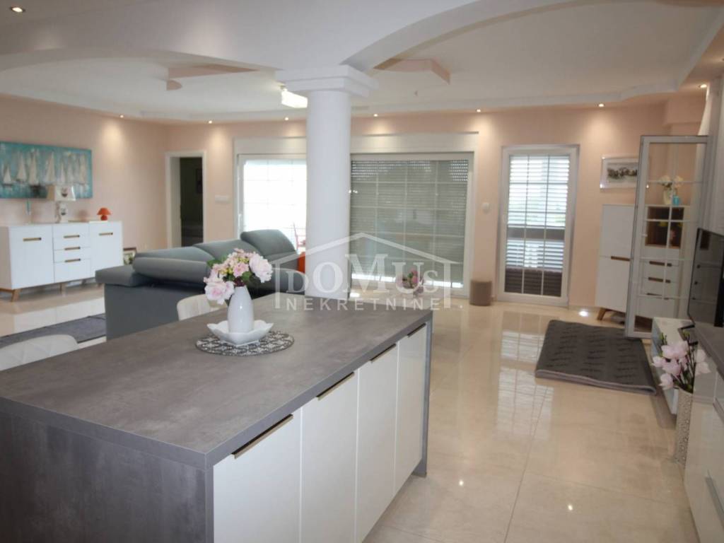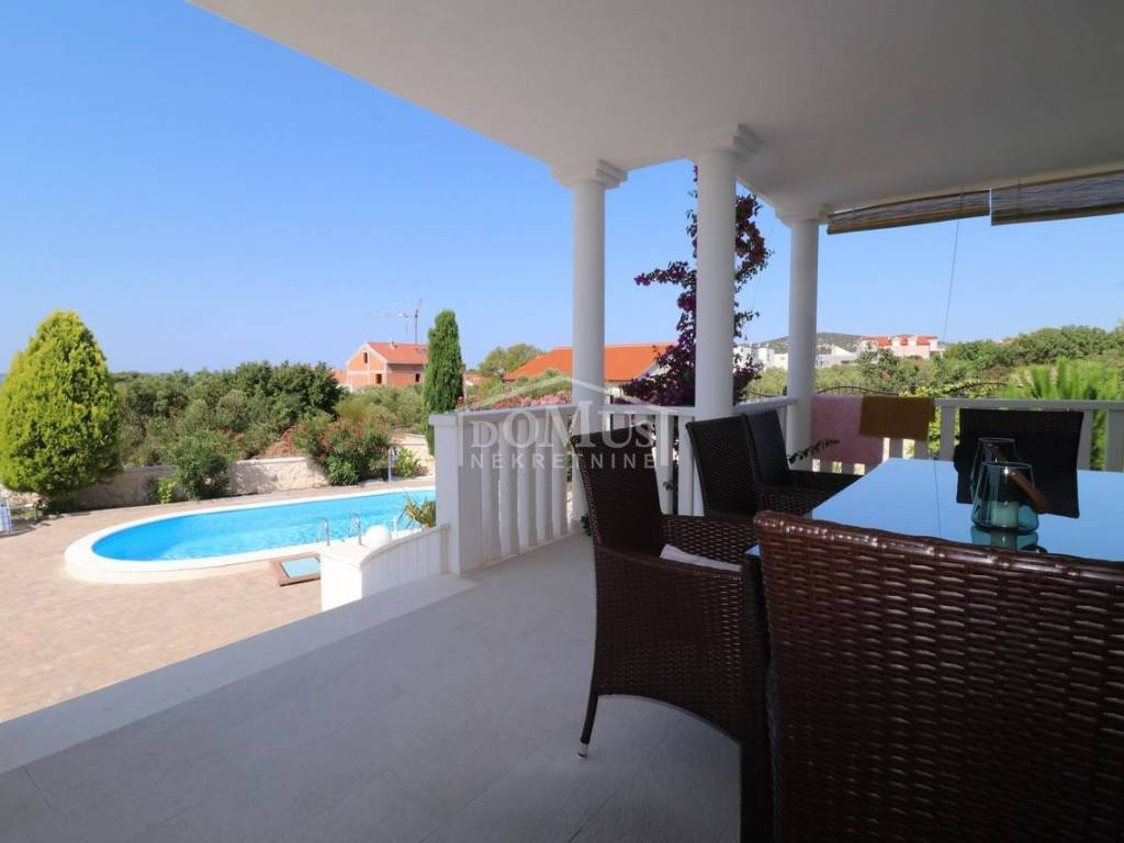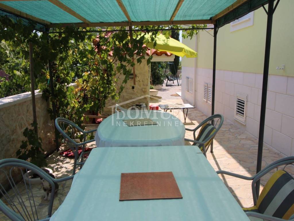 Villa with a pool, newly built, on the land plot of 1.020m2, located at a very quiet area that provides complete privacy to its owners. Villa has three floors: basement, ground floor and top floor with total of 329,71m2 useful area. In the basement, there is apartment S1 with 65,63m2 living area and a storage room with a pantry with total of 25m2. There is a separate entrance to the ground floor with luxuriously equipped apartment S2 with a total of 143,18m2 living area + terrace 25,86m2 which consists of interior staircase, hallway, 3 bedrooms and each bedroom has its own bathroom, kitchen and spacious dining area, comfortable living room with exit to a large covered terrace overlooking the sea, Tribunj and nice courtyard. On the ground floor there is also a double garage of 37,50m2 (for two cars) which has a separate entrance to the villa, as well as another room and a toilet. Interior staircase lead to the top floor where S3 1-bedroom apartment is located, with total of 30,09m2 living area + terrace 17,85m2 with a sea view. An integral part of this beautiful property also features a 4m x 8m pool. The courtyard is nicely arranged and enriched with Mediterranean herbs, while the interior has modern design. Distance to the beach is 600m, and to the center 400m.