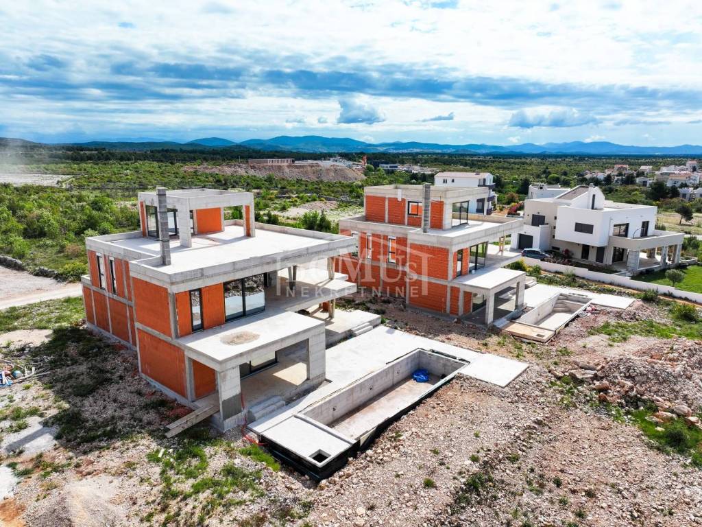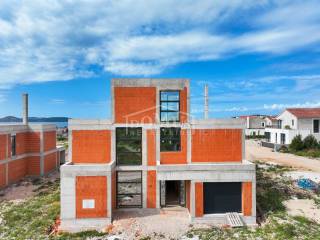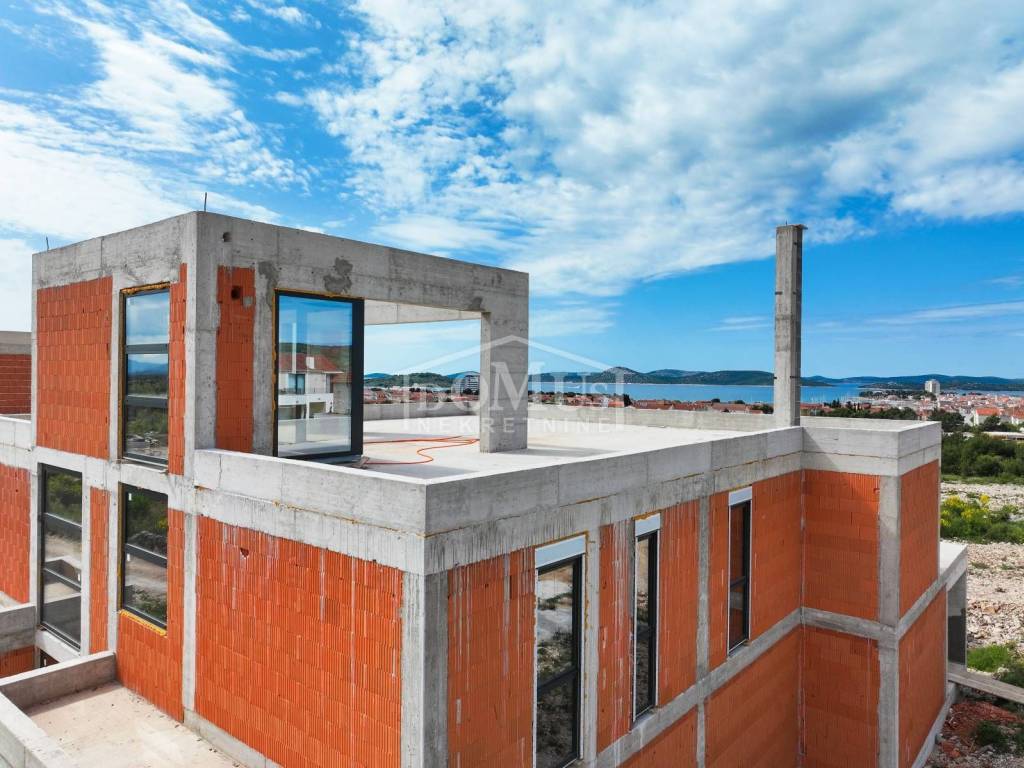 Villa in Vodice, located on a plot of 943m2, the villa offers a panoramic view of the sea and the Vodice archipelago. Away from the hustle of the city, the villa offers a peaceful and relaxing environment to escape from everyday stress and enjoy privacy. Designed with modern architecture, the villa is a symbol of contemporary style and elegance. Clean lines, spacious terraces and carefully selected materials create an aesthetic impression. With its three-story structure, the villa has 489 m2 of usable area, of which 277.54 m2 is closed living space, and offers its future owners plenty of space for a comfortable life. The spacious outdoor area includes a 38.96 m2 swimming pool surrounded by a sun deck, creating an ideal place to relax and socialize outdoors with a panoramic view of the sea. The spacious interior of the villa includes the main entrance area, hallway, laundry room, guest toilet, garage, open space kitchen with dining room and living room and access to a spacious covered terrace/pool/sunbed/garden with a wonderful view of the sea, and a comfortable bedroom with its own the bathroom. On the first floor there are three comfortable bedrooms, each with its own bathroom. Two bedrooms as well as a fitness room with shower and sauna are oriented to the south and have access to a large and spacious terrace with a view of the sea. Internal stairs lead to the 2nd floor, where there is a large terrace with a panoramic view of the sea, ideal for sunbathing and enjoying the panorama, of course with electricity and water connections and the possibility of installing a jacuzzi. Although it is located in a quiet environment, the villa is only 1300 meters from the sea/beach and 1700 meters from the city center, 500 m from all facilities (shops, playgrounds, etc.), and an extraordinary location between 2 airports (Split and Zadar), it provides a balance between privacy and ease of access to all amenities for both vacation and life, while enjoying the Mediterranean climate.
