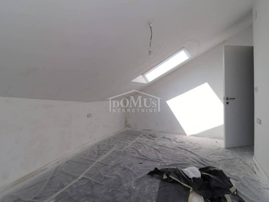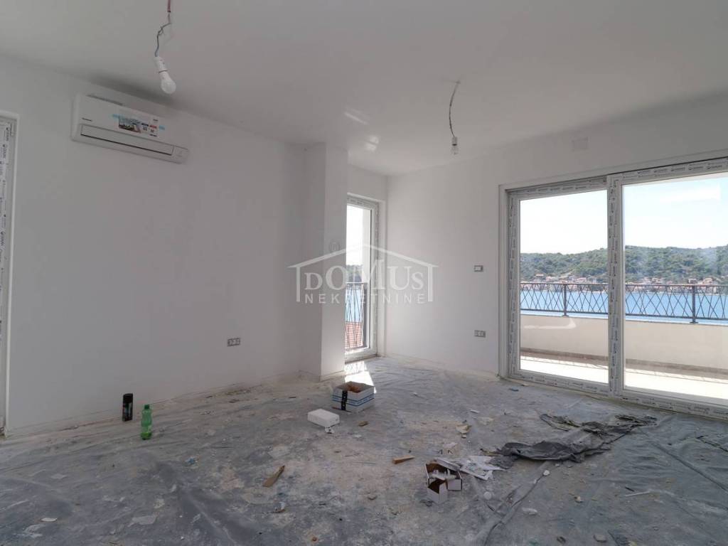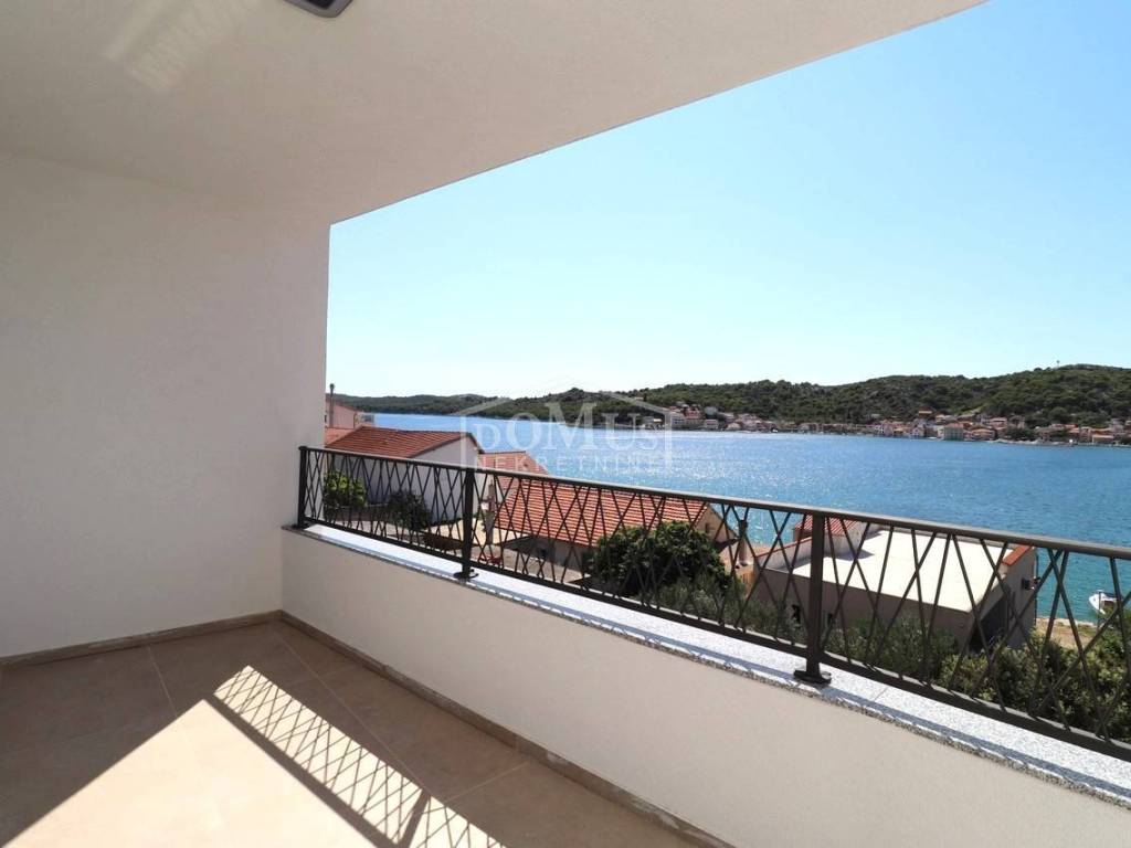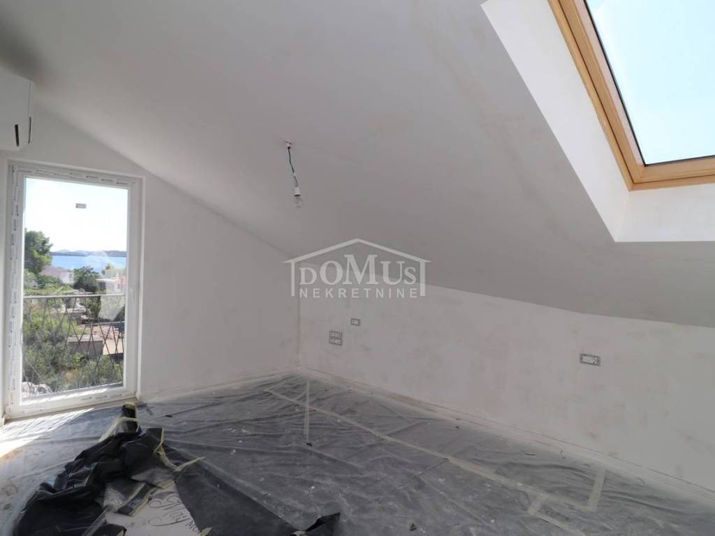 New construction, attractive location, 2nd row to the sea, two-story apartment with a panoramic view of the sea with a total of 86.02 m2 of usable area. The apartment has a modern design and functional layout and is located on the 2nd floor and attic of a residential building, oriented to the southwest. It consists on the 2nd floor of an entrance hall, a bathroom, a living room with a kitchen and a dining room, a loggia of 9.96 m2, a staircase, and in the attic three bedrooms and a bathroom. The apartment is built of high-quality materials, equipped with Panasonic air conditioners (multi-split system) in every room, electric underfloor heating throughout the apartment, heat pump for hot water, PVC carpentry with aluminum shutters with mosquito nets, anti-burglary/fire doors. The apartment has one garage parking space of 14.5 m2 (Hormann electric lift garage door) and a storage room. The apartment is 70 m from the beach and 1200 m from the town center.