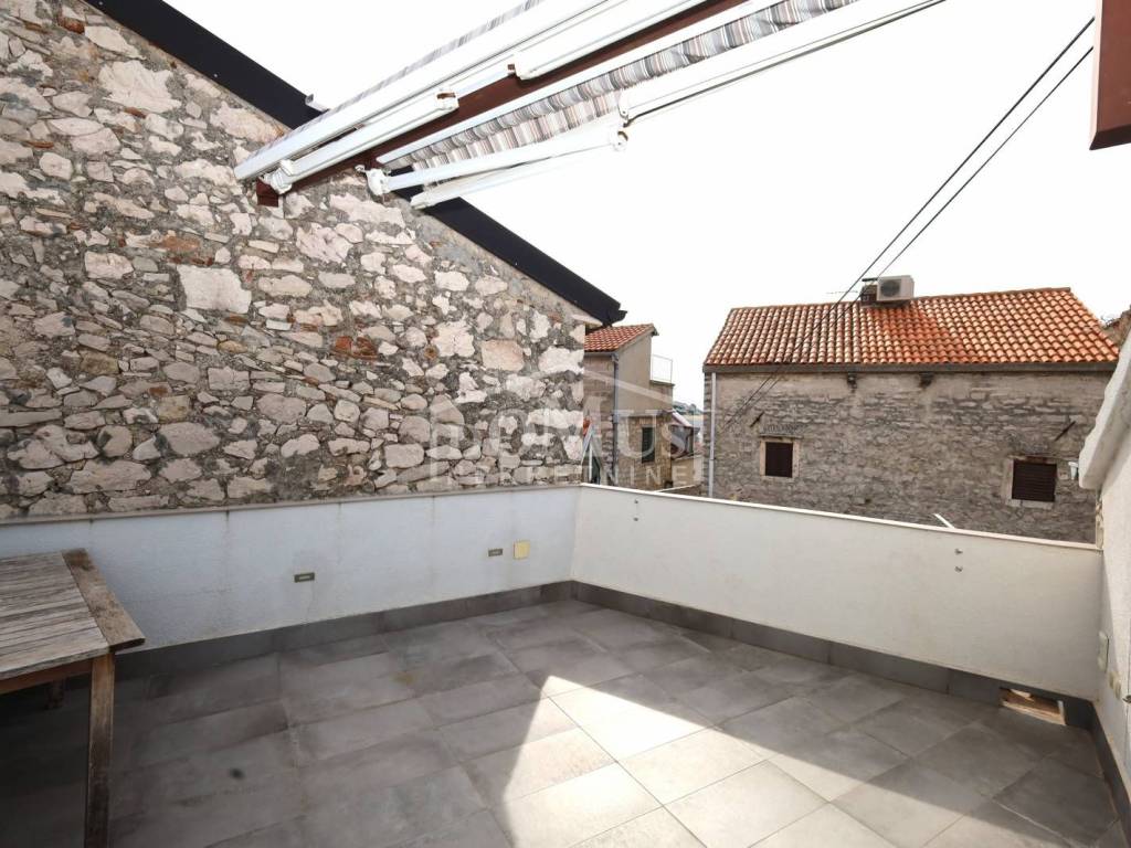 Tribunj, renovated stone house in the heart of the old town, on the island, just 30 meters from the seafront and the sea. The house has a total living area of 81.26 m², spread over three floors: ground floor, first floor, and second floor with a 15.76 m² terrace offering a view of the old center of Tribunj.