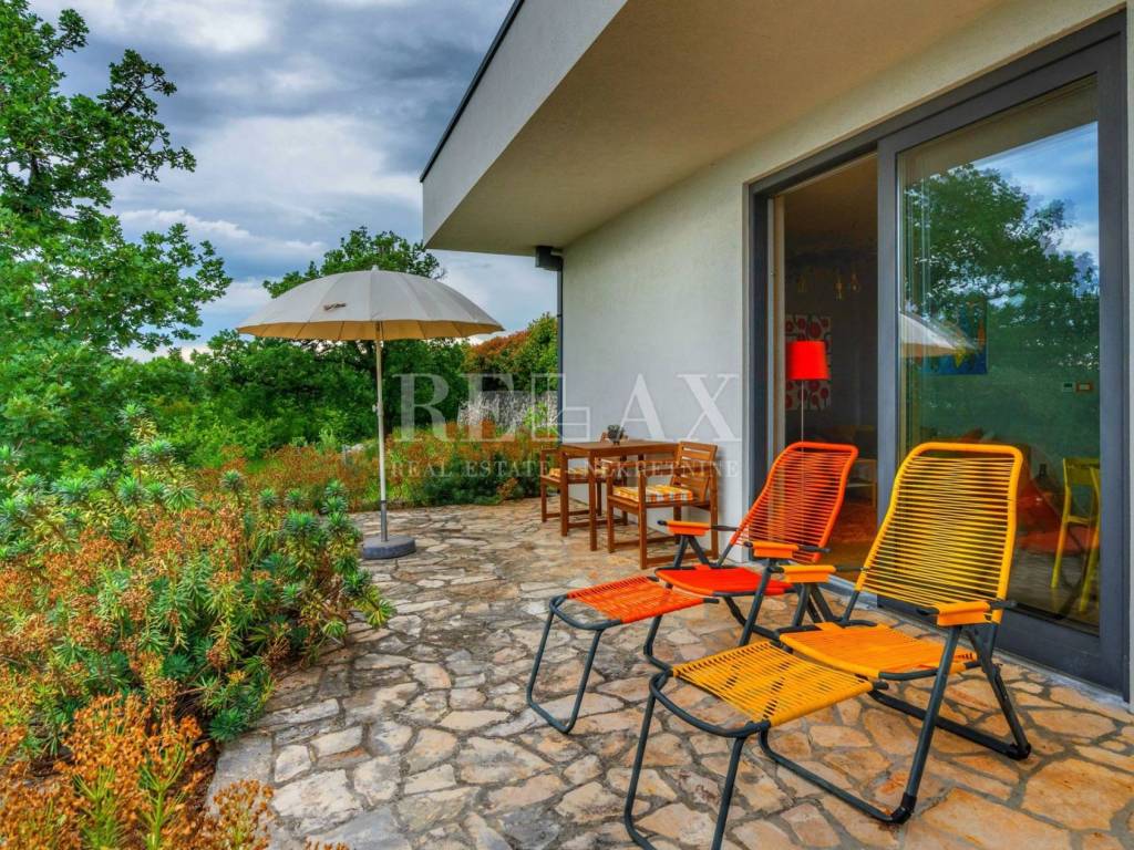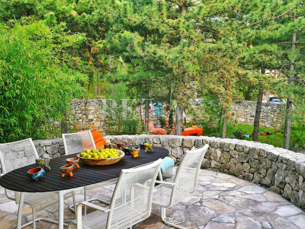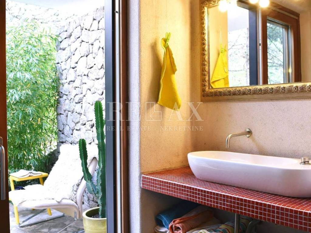 In an exceptional location in Kostrena, just 900 meters from the sea and promenade, lies this unique villa with a breathtaking view of the Kvarner Bay, an infinity pool, and a landscaped plot of 1,333 m² that ensures complete privacy and a Mediterranean ambiance.