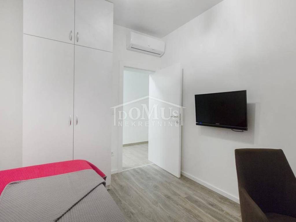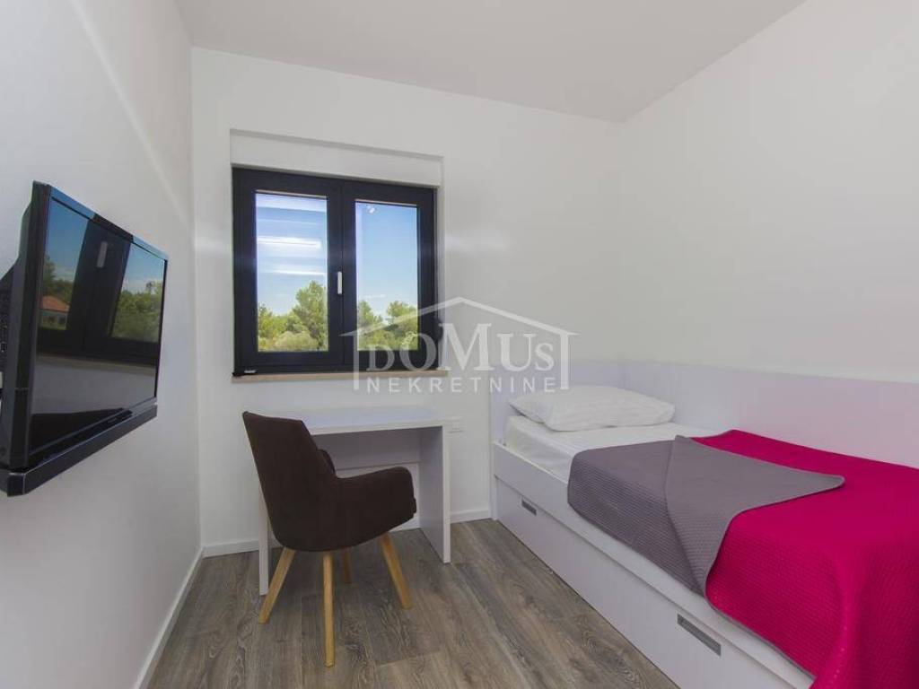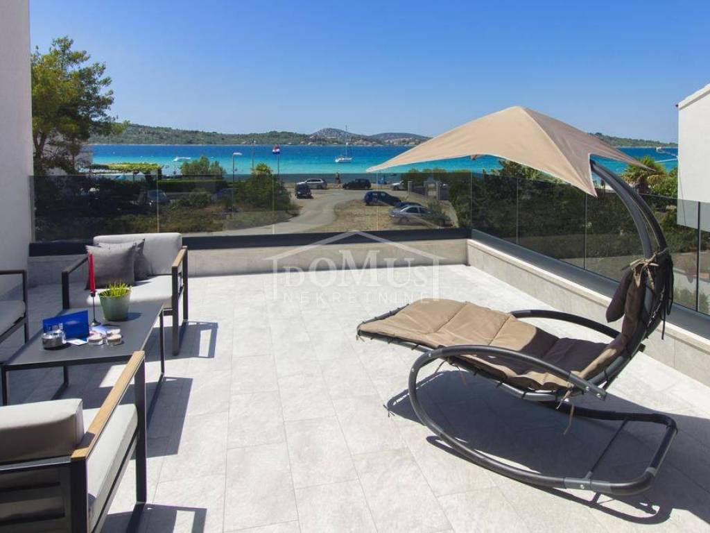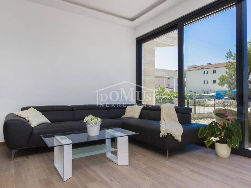 Attractive location, 2nd row to the sea, modern villa with a swimming pool and a garage. Villa has two floors: ground floor + 1st floor with a total of 154,66m2 useful area. The ground floor consists of a spacious living room and kitchen with dining area, 1 bedroom, corridor, bathroom and separate entrance to garage. Internal stairs lead to the 1st floor with a hallway, three bedrooms, one of which with its own bathroom and exit to a spacious terrace of 44m2 with a beautiful sea view, separate bathroom. Top quality equipment and modern furnishings make this property one of the most beautiful Real-estate in Srima. The villa is covered with natural stone, has a glass fence, floor-heating throughout the house, air conditioning with inverter, Schuko windows (3-layer glass) sliding mechanism - large glass wall with electric shutters. Floor coverings are parquets and tiles. The courtyard is fenced; there is a garden and beautifully arranged sunbathing area with an 18m2 swimming pool. Distance from the center is 600m and from the beach only 60m.