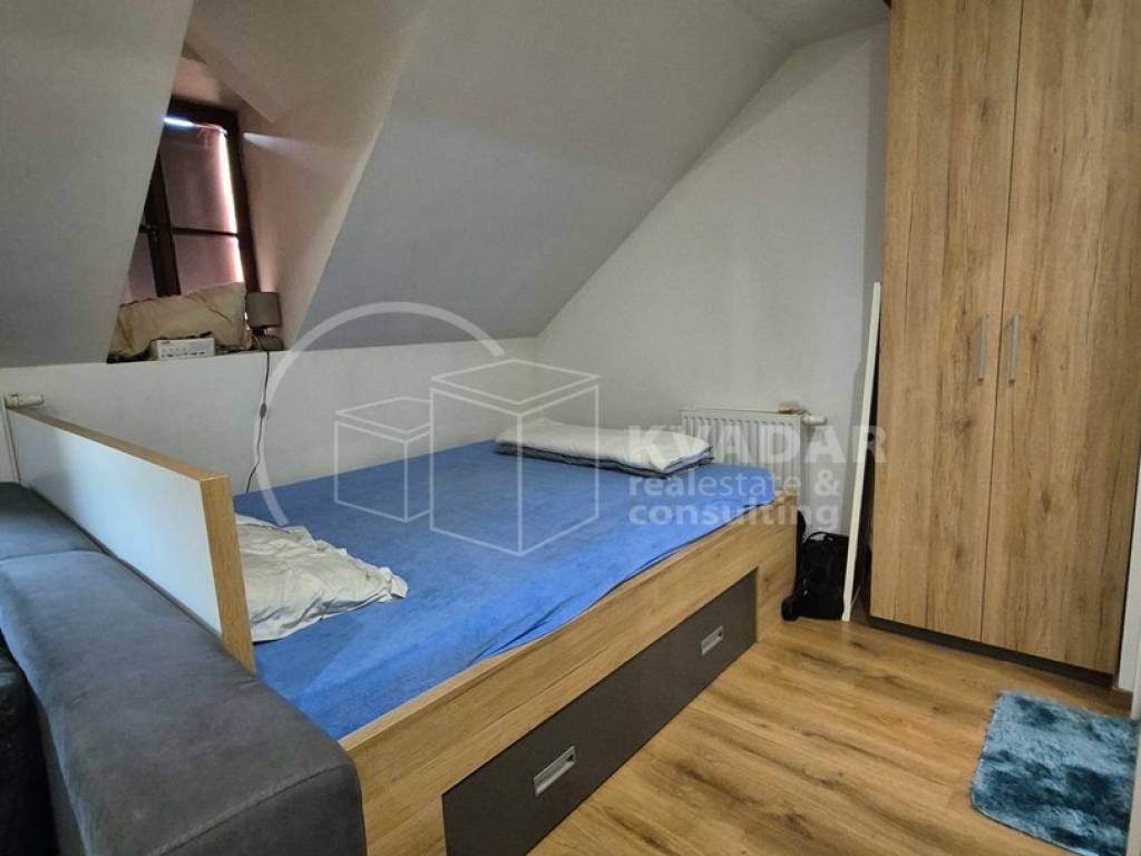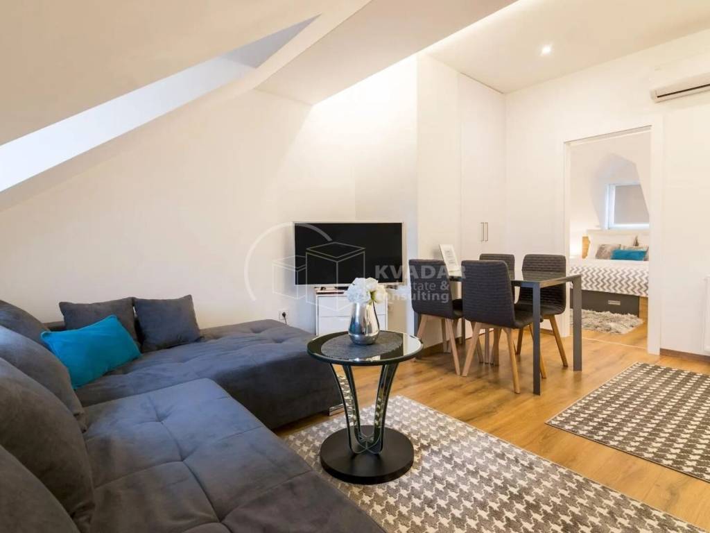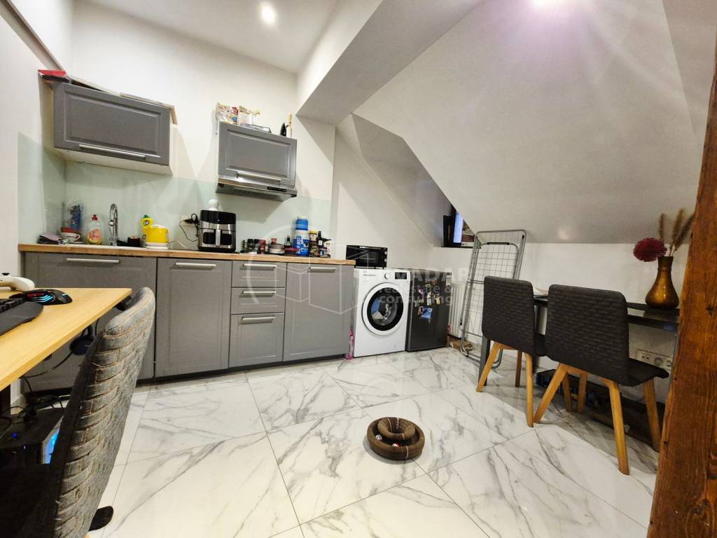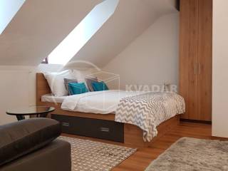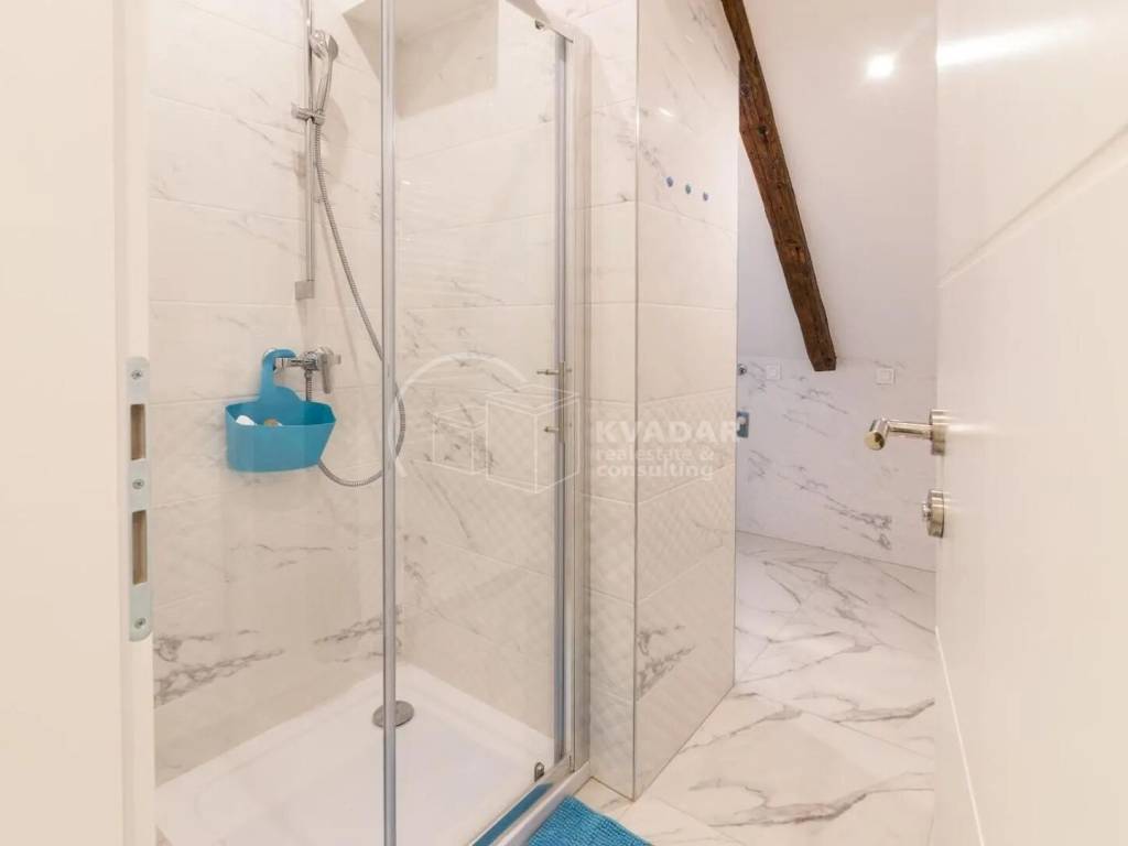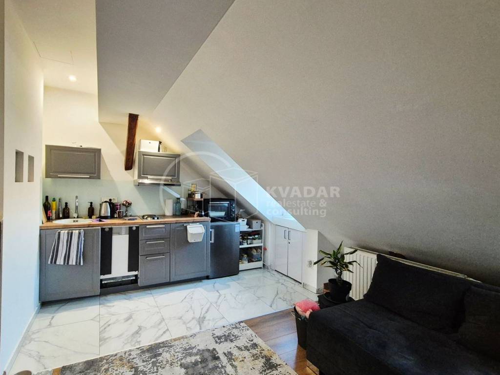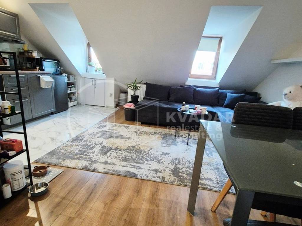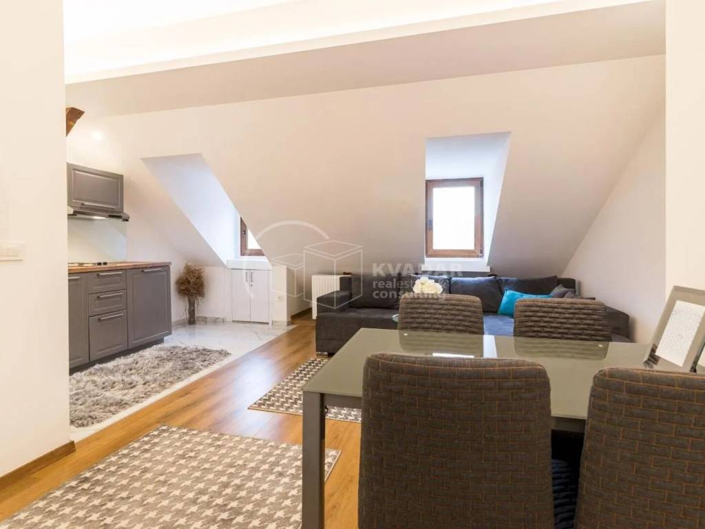 Stan je u potkrovlju zgrade bez lifta, površine 72m2 (podno 87m2) i organiziran je kao dvije potpuno odvojene stambene jedinice, sa kompletno opremljenim kuhinjama i kupaonicama. Veća stambena površina ima i zasebnu spavaću sobu. Oba stana su trenutno u najmu.