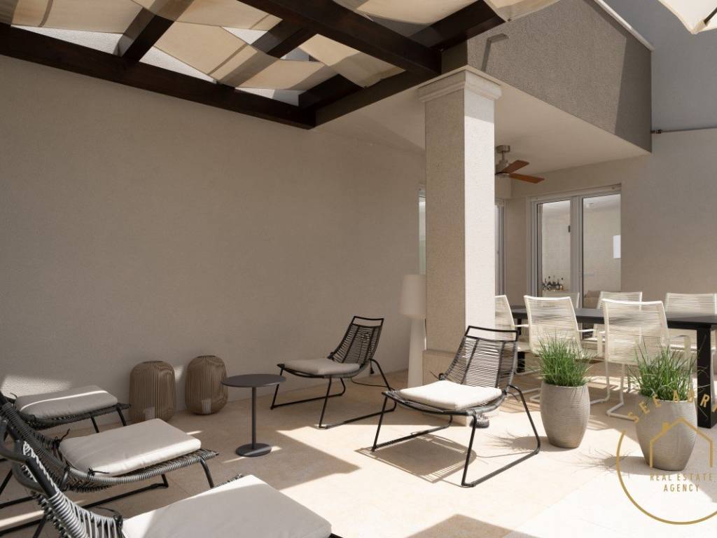 The house consists of ground floor, first floor and attic. On the ground floor there is a beautiful apartment, with two bedrooms, a spacious living room with kitchen, connected to the outdoor terrace and yard, and one bathroom and one toilet. On the first floor there are 2 judges' apartments, each with one bedroom, bathroom, living room, kitchen and terrace. In the attic there is a bedroom and a separate toilet.