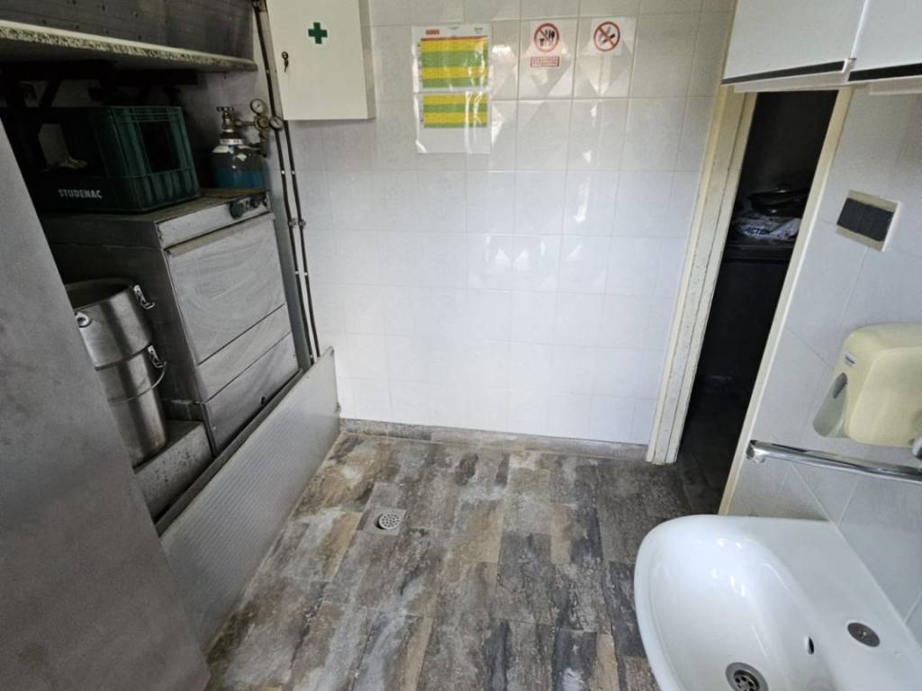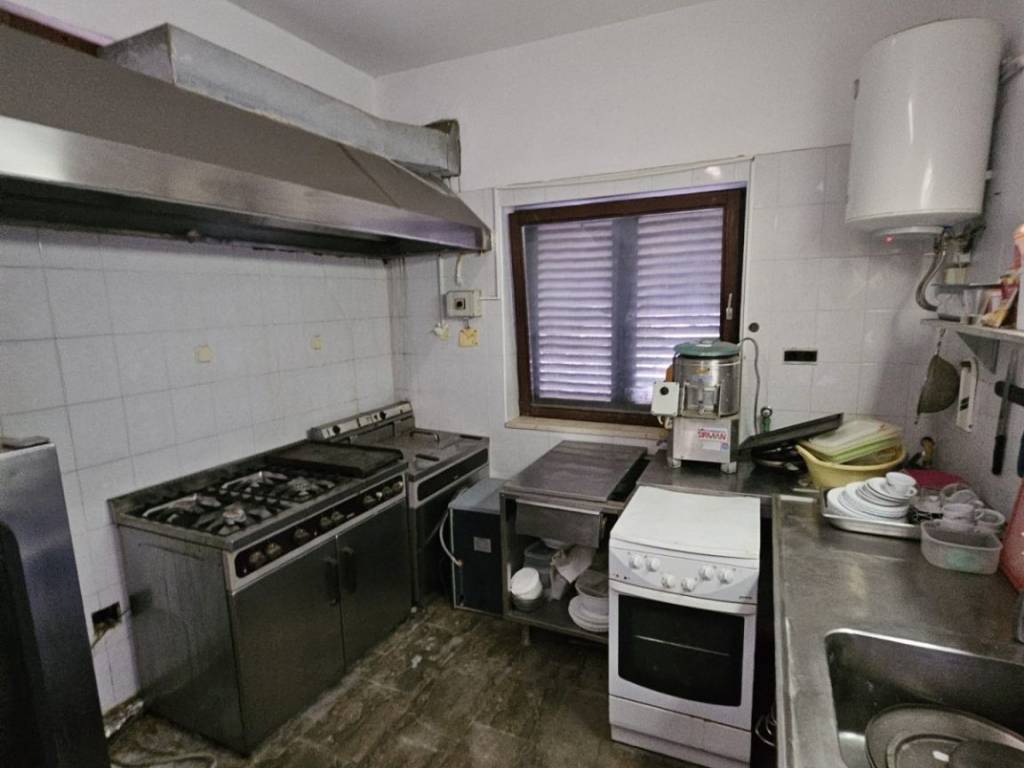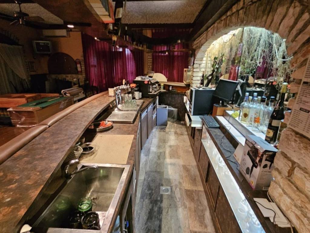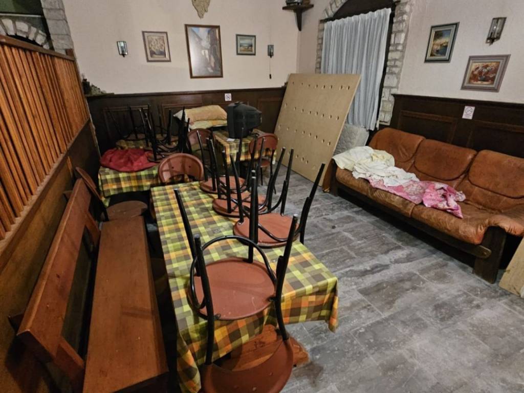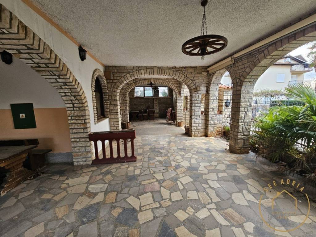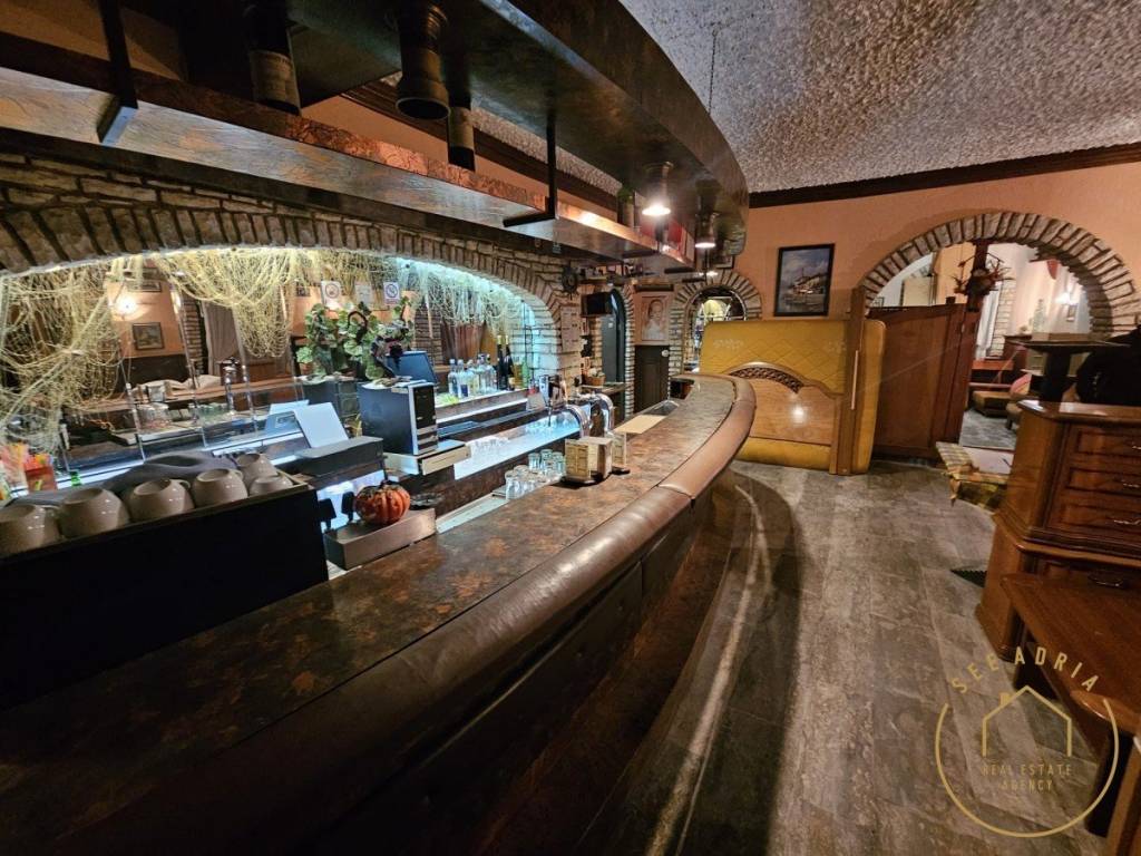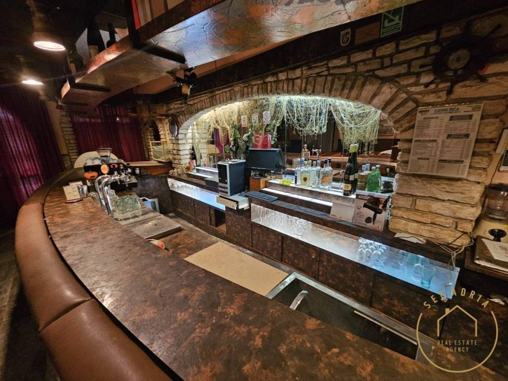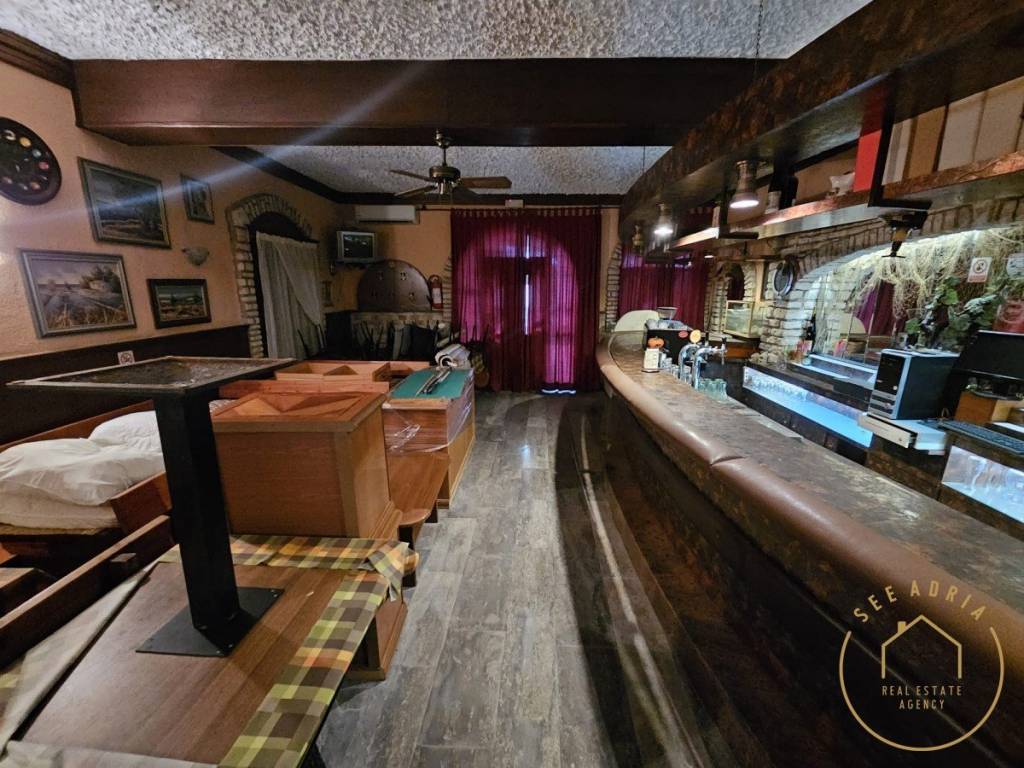 The building is a self-contained building where the ground floor has a restaurant-type hospitality facility with a main restaurant hall and a small hall, a kitchen with accompanying rooms, separate sanitary facilities for male and female guests, and a bar area. The outdoor open terrace is arranged for serving guests in the summer months with an uncovered and covered part. On the first floor, there is a larger residential unit, completely finished except for the open terraces, where only waterproofing has been installed.