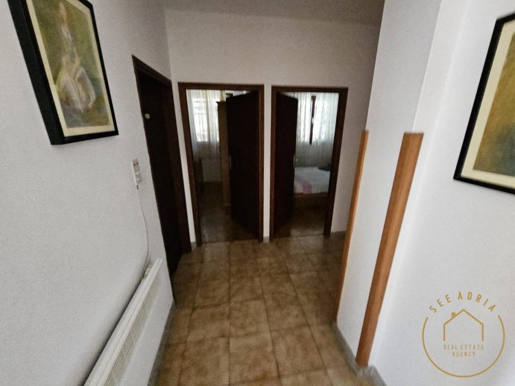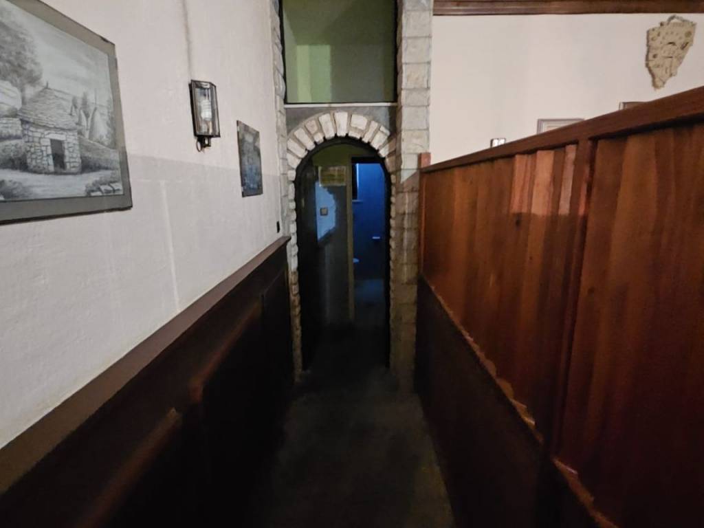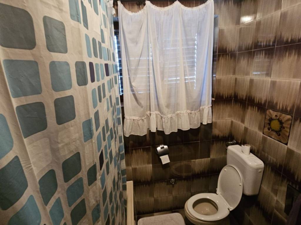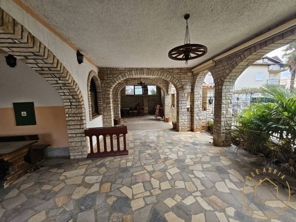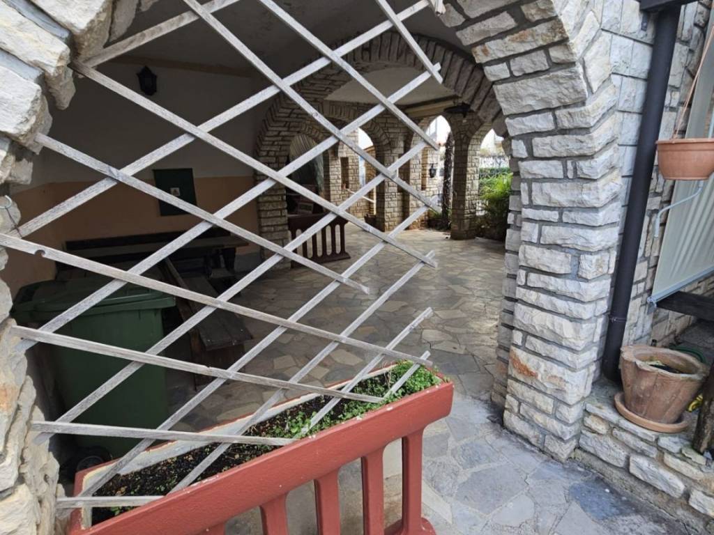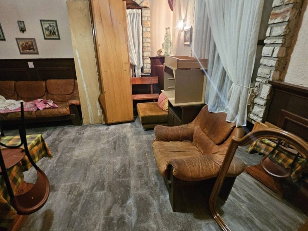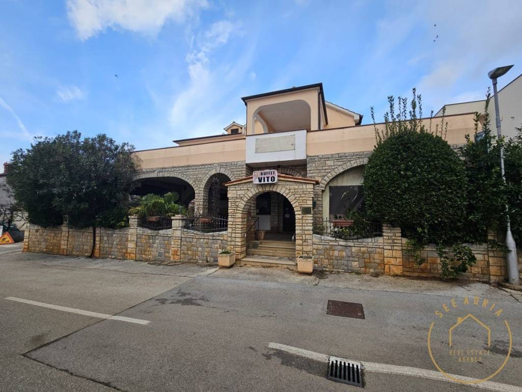 The building is a self-contained building where the ground floor has a restaurant-type hospitality facility with a main restaurant hall and a small hall, a kitchen with accompanying rooms, separate sanitary facilities for male and female guests, and a bar area. The outdoor open terrace is arranged for serving guests in the summer months with an uncovered and covered part. On the first floor, there is a larger residential unit, completely finished except for the open terraces, where only waterproofing has been installed.