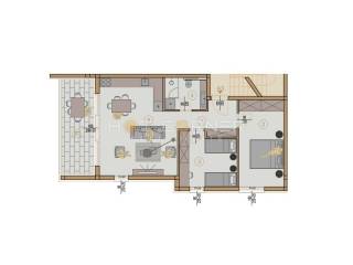 Apartment A1 consists of living room, kitchen and dining room (23.97m2), hallway with wardrobe (5.47m2), 2 bedrooms (13.02m2 and 10.52m2), bathroom (5.32m2) and covered terrace (10 ,21m2, reduced area 5.11m2), storage (2.75m2, reduced area 1.38m2), 2 outdoor parking spaces (each area 12.5m2, reduced area each 2.5m2), and a large garden (95m2, reduced area 9.5 m2). Total net area 79.29m2.