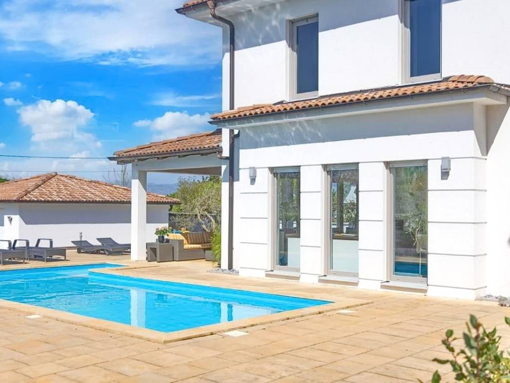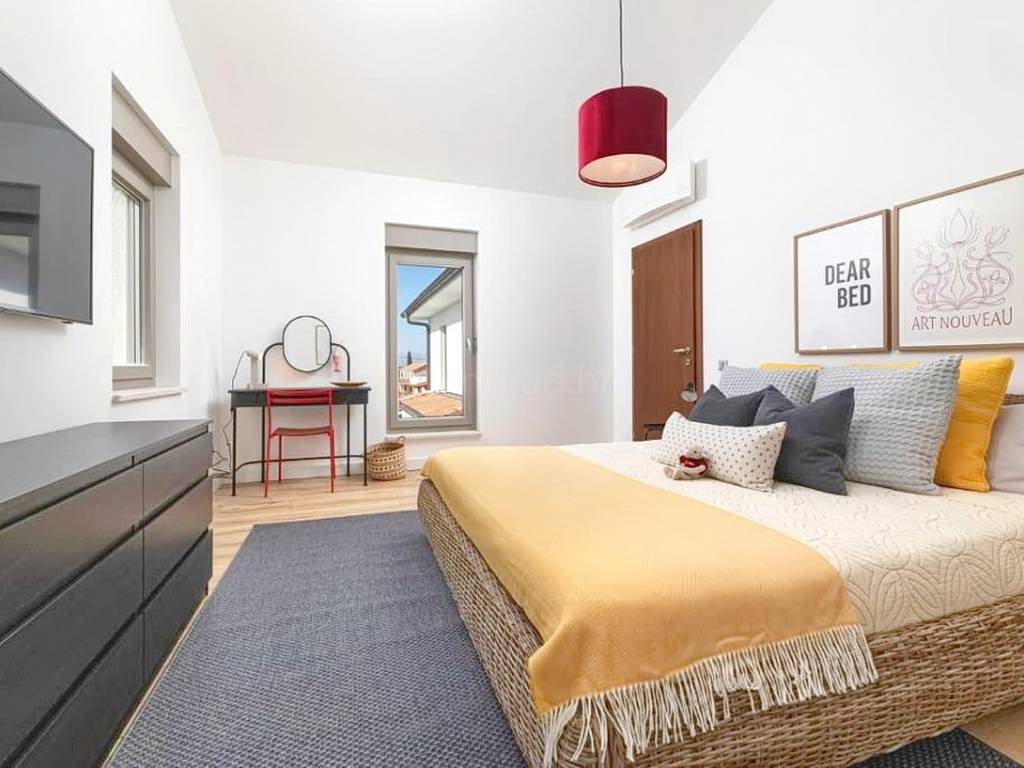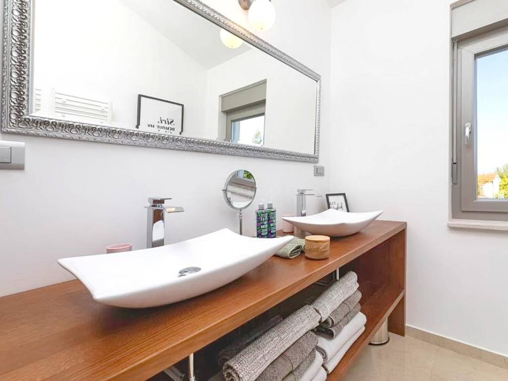 Offered by the Stan Grad Immobilien agency on the Kvarner Riviera is an exceptional Mediterranean urban villa, built according to a contemporary architectural design, located in an attractive part of the northern Adriatic on the island of Krk. The house is situated in a peaceful and pleasant location, not far from the center of the well-known tourist town of Malinska, making it an ideal combination of privacy and accessibility. This detached, two-story villa stands out with its modern design and outstanding functionality.