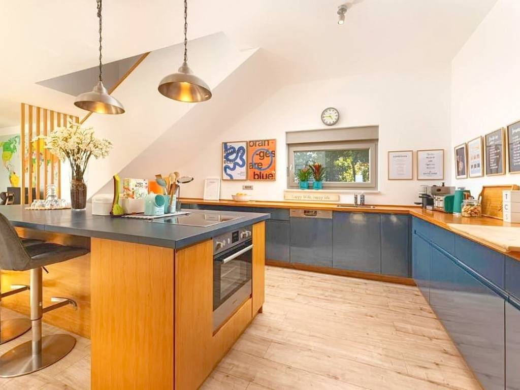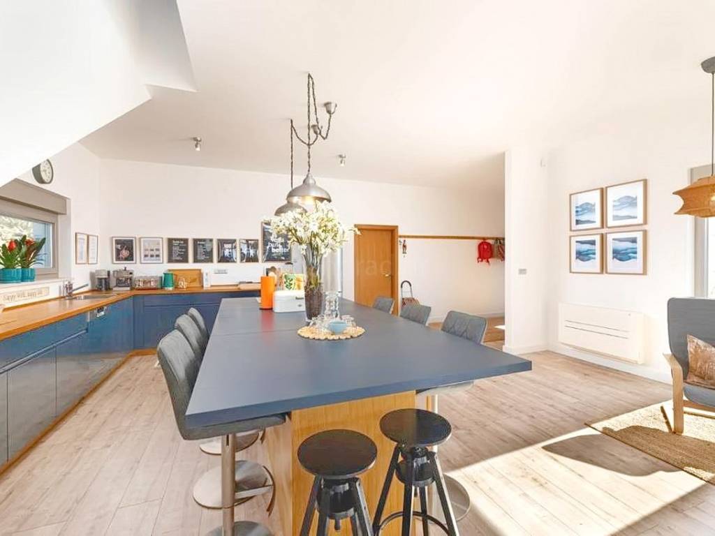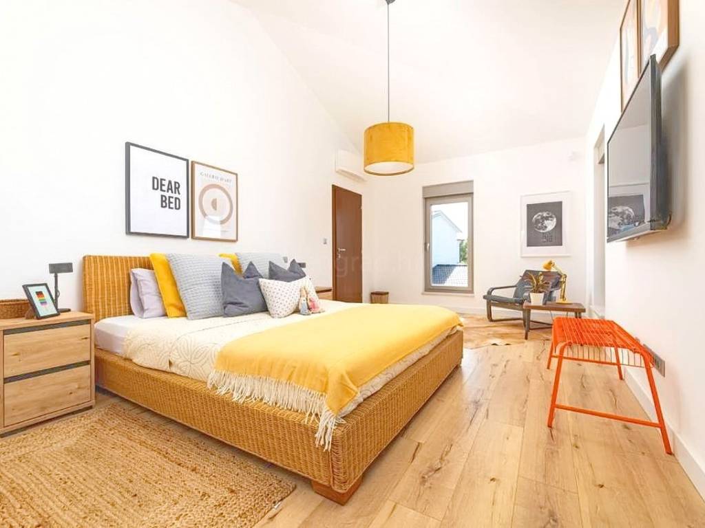 The total living area of the house is 284 m² and it is thoughtfully designed as a comfortable home for a single family. The ground floor comprises an entrance area, a spacious open-plan living room with a kitchen and dining area, a hobby or study room, a bathroom, and a large covered terrace ideal for outdoor living. The upper floor features three generously sized bedrooms and two modern bathrooms. The property is fully equipped with designer furniture and high-quality technical appliances, allowing for immediate move-in without additional investment.