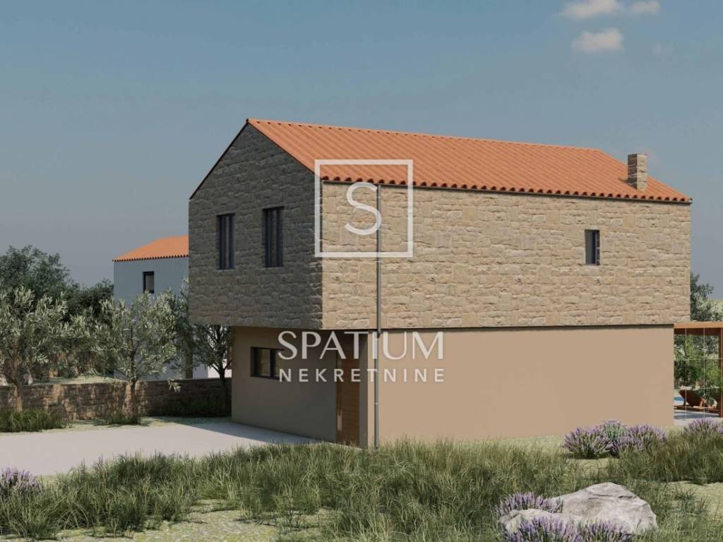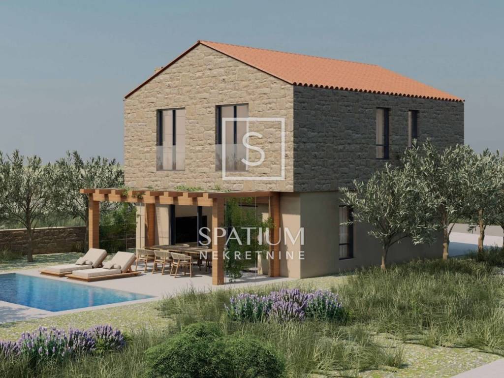 JURŠIĆI, u ponudi je građevinsko zemljište površine 547 m², smješteno na mirnoj lokaciji na samom kraju sela. Parcela je pravilnog oblika, omeđena suhozidima s dvije strane te ima izravan pristup s javnog puta. Prodaje se zajedno s glavnim projektom i pravomoćnom građevinskom dozvolom za izgradnju samostojeće kuće od 120 m² neto površine, raspoređene na prizemlje i kat. Prema projektu, u prizemlju su predviđeni open-space dnevni boravak, kuhinja i blagovaonica, ostava, toalet i hodnik, dok se na katu nalaze tri spavaće sobe, svaka s vlastitom kupaonicom. Projekt uključuje i pomoćne objekte: bazen od 28 m², spremište s bazenskom tehnikom, biološki pročistač te dva parkirna mjesta. Vanjska terasa prostire se na 40 m², a parcela već ima priključke za vodu i struju, nekoliko stabala maslina te pripremljen i očišćen teren za početak gradnje. U cijenu je uključen i prirodni kamen namijenjen za gradnju.
