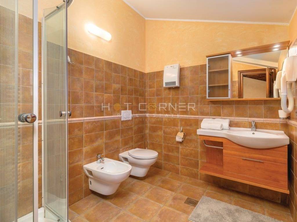 On the ground floor there is a large living room with a fireplace, a wellness center and a spacious kitchen that opens onto the back terrace and flower garden.