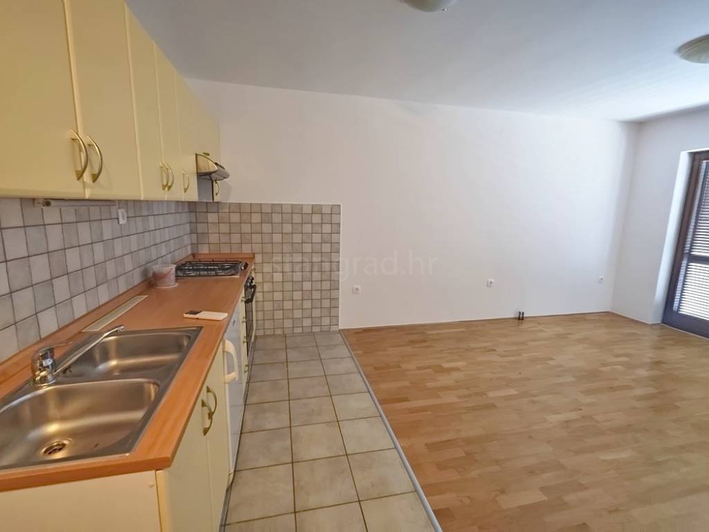 The apartment is situated on the ground floor of a well-built residential building and has a total area of 41 m². The interior includes an entrance hallway, a living room with kitchen and dining area, one bedroom, a bathroom, and a covered terrace. The interior is partially cleared of previously used furniture pieces.