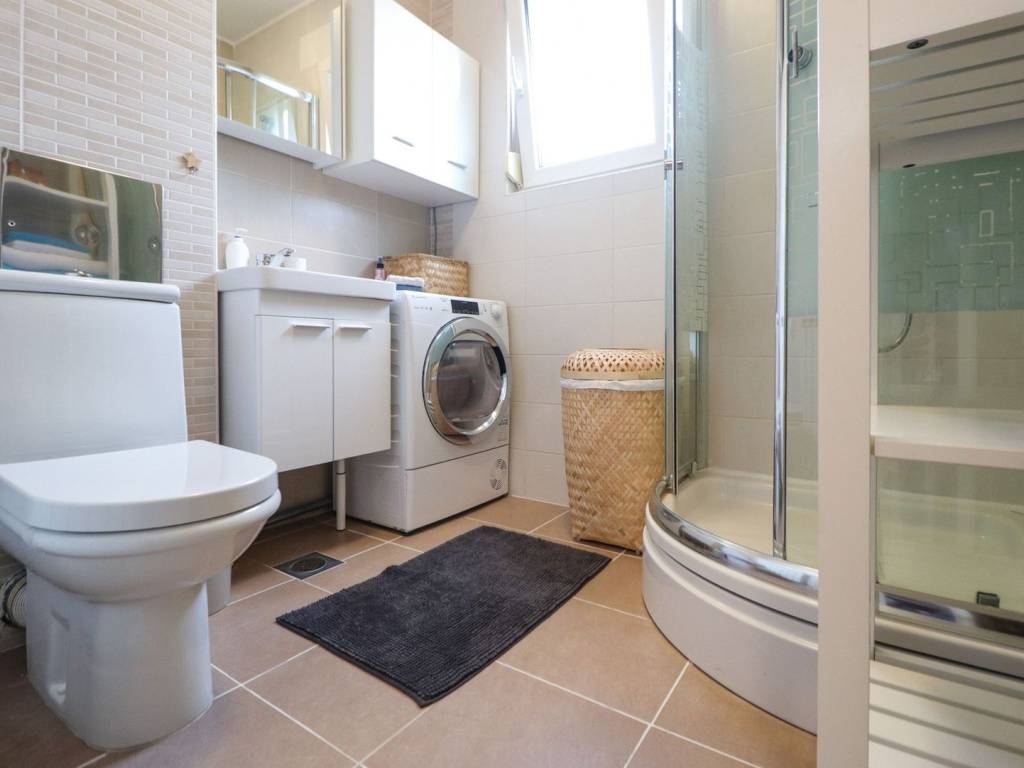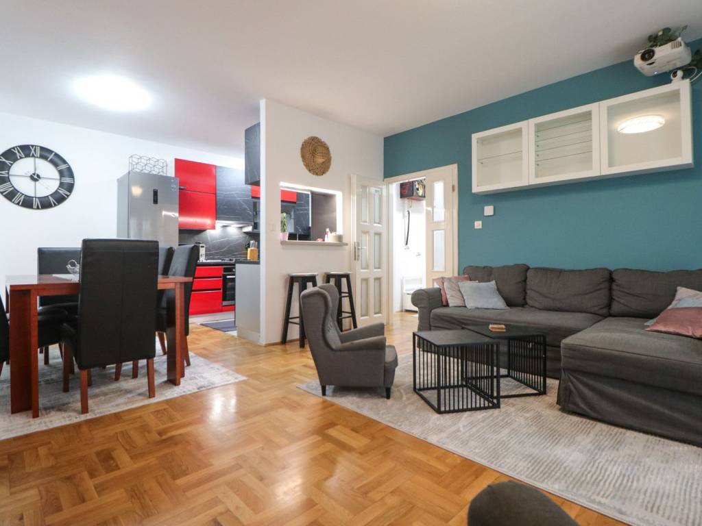Kompletno je namješten i u cijelosti opremljen - klima uređaj, video projektor, perilica posuđa, perilica rublja, hladnjak sa zamrzivačem, pećnica, 3+1 štednjak, napa, mikrovalna pećnica, aparat za kavu, čaše & posuđe, bračni krevet, dječji krevet na kat, kauč, blagovaonski stol, radni stol, video portafon, protuprovalna vrata, PVC stolarija, alarmni sistem, itd. Prostor je odlično iskorišten ugradbenim ormarima i ormarićima, a u kuhinji je ugrađena i manja ostava.