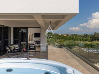 In the tranquil village of Lovrečica, Umag, a stunning modern villa is on offer. This exquisitely designed property, spanning 278 square meters, is nestled within a beautifully manicured 756-square-meter garden, promising an elite living experience.