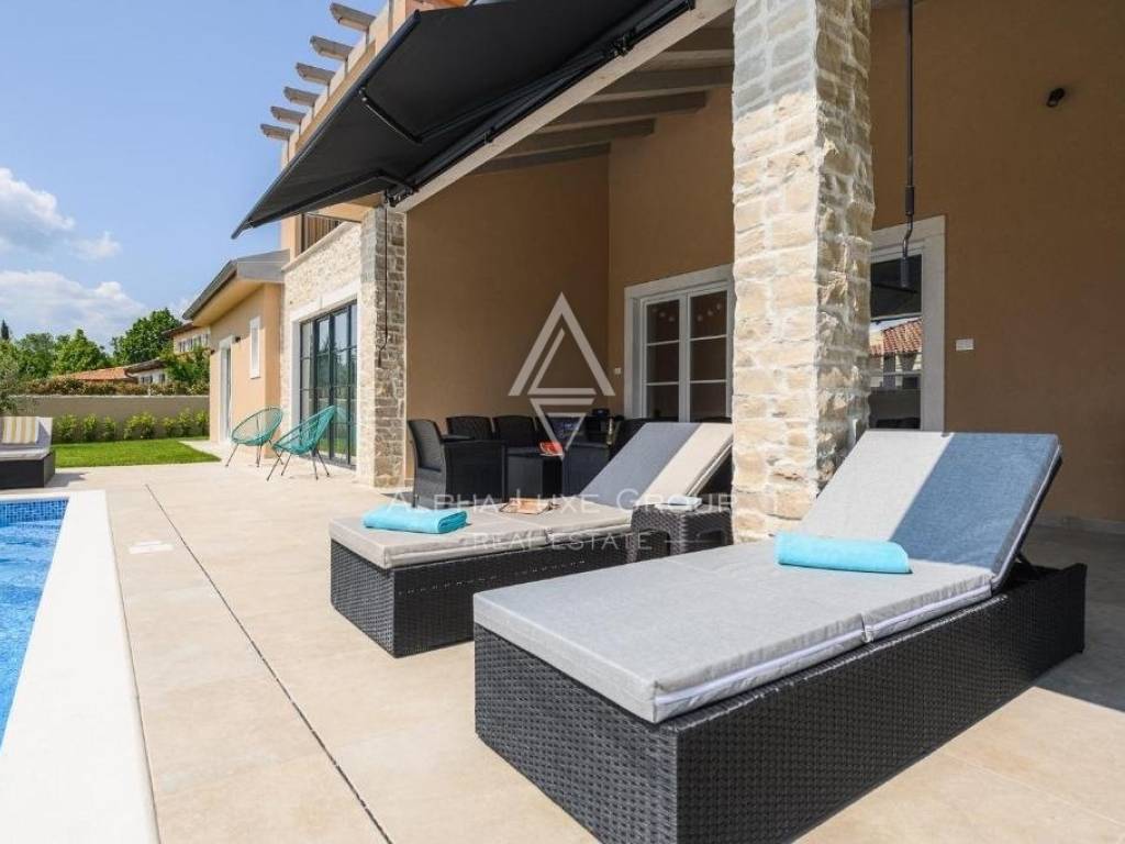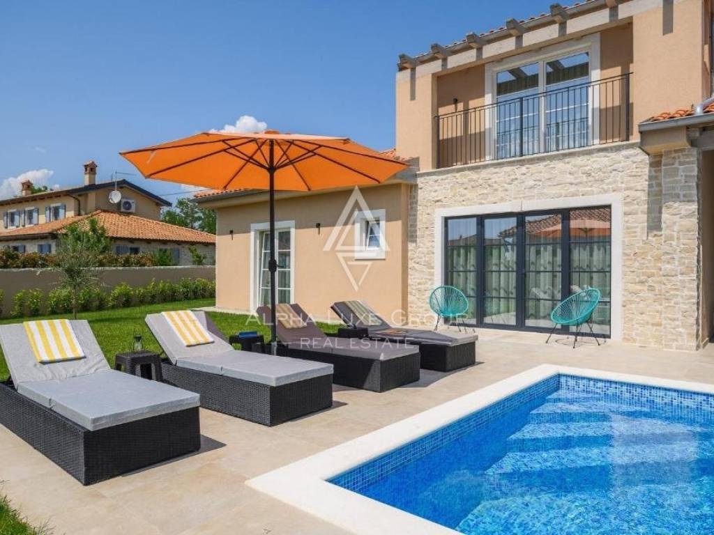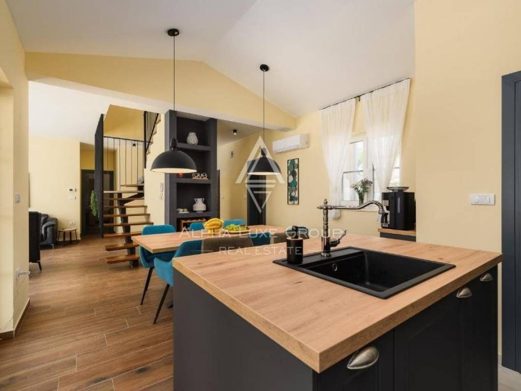 In the tranquil village of Kanfanar, nestled in the heart of Istria's hinterland, a stunning home offering modern comforts and timeless architecture is available for purchase. Just a 15-minute drive from Rovinj, this property provides a blend of mild Mediterranean climate and the natural landscape of inner Istria, appealing to both nature lovers and those appreciative of historical heritage.