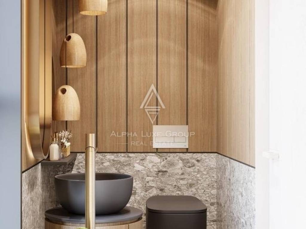 The upper floor, accessible by an internal staircase, includes two bedrooms, each with its own bathroom, a storage room, and a large terrace equipped with a lounge area and a hot tub. The beautifully landscaped and fenced garden encompasses a swimming pool with a sunbathing area, providing a private oasis.