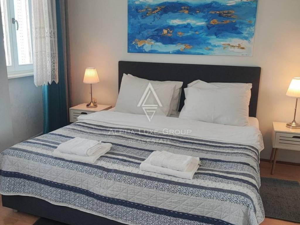 The apartment consists of two spacious bedrooms, each with large windows that provide plenty of natural light and a beautiful view of the sea and the old town architecture. The bathroom also has a window, making the space bright and airy.