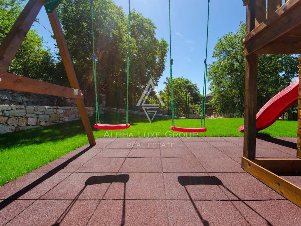 Next to the main residence is an additional 50 m² of unfinished interior space arranged across two floors, giving future owners the opportunity to create extra rooms, a wellness area or custom-designed features. Outdoors, the property includes a heated 24 m² saltwater swimming pool, a sunbathing terrace, a barbecue area and a landscaped garden with a dedicated 120 m² children’s playground. The estate also includes 200 m² of additional building land for future expansion.