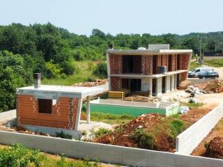 In a peaceful village near Poreč, located just a 10-minute drive from the coast and the city center, a modern villa is for sale, currently under construction, situated on a spacious plot of land measuring 1080 m2, offering tranquility and privacy.