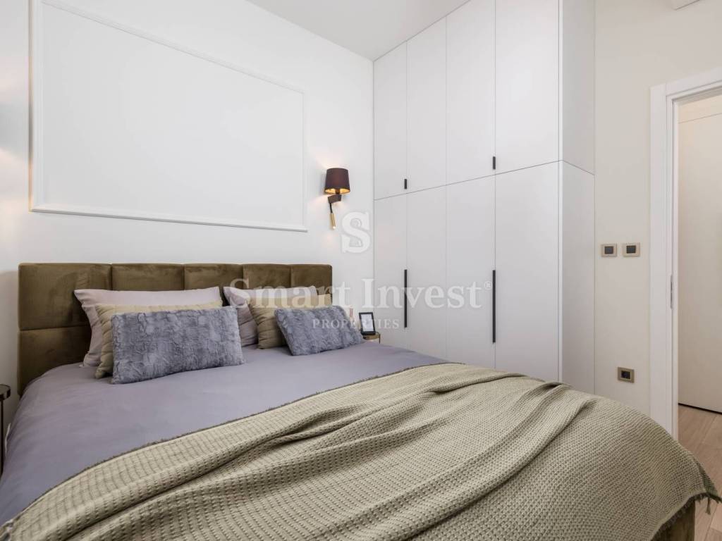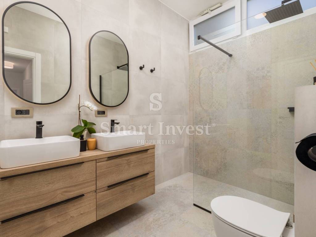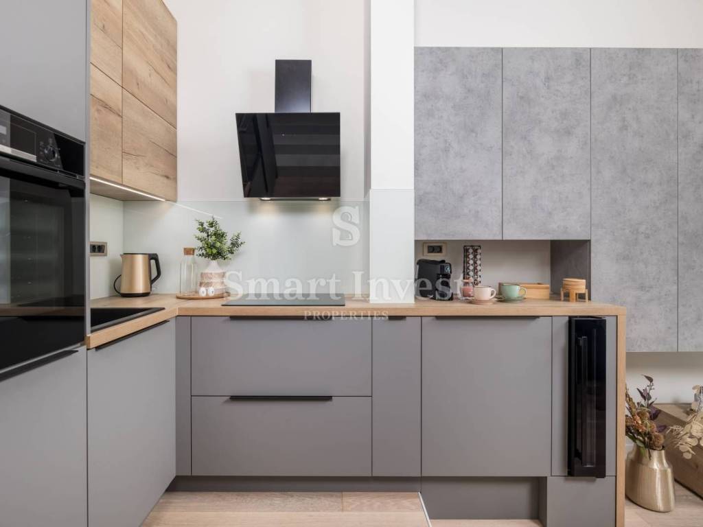 The apartment has been carefully renovated to retain the authentic characteristics of the old villa, such as high ceilings, three-layer wooden parquet floors and decorative stucco, but with modern elements such as a glass wall, minimalist furniture and contemporary appliances. The living room is bright and spacious, with large windows that allow plenty of natural light and offer a beautiful view of the surrounding garden. The space is furnished with modern, but elegant furniture in neutral tones, creating a relaxing atmosphere.