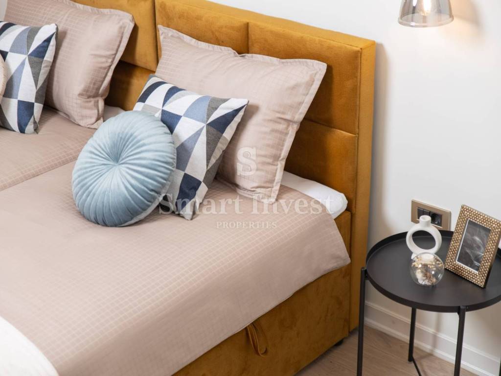 The apartment has two bedrooms, equipped with large comfortable beds, built-in wardrobes, and each with its own air conditioning. The bathroom is luxurious, with underfloor heating with a modern shower, and quality sanitary ware. The toilet also has underfloor heating with quality sanitary ware. All appliances in the apartment are energy efficient, and each room has air conditioning for added comfort during the warm summer months.