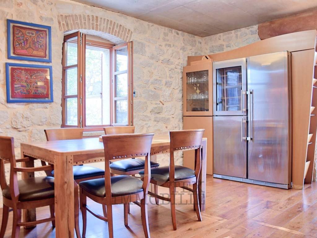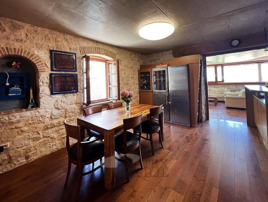 The ground floor features a tiled courtyard of 30 m², an entrance hallway, two work rooms, and a bathroom. The work rooms, measuring 13.70 m² and 11 m², can easily be converted into bedrooms. The courtyard is adorned with an old olive tree, a bench, and elegant wrought iron details, creating a pleasant space for relaxation. The interior staircase, also made of wrought iron, adds to the aesthetic value of the interior.