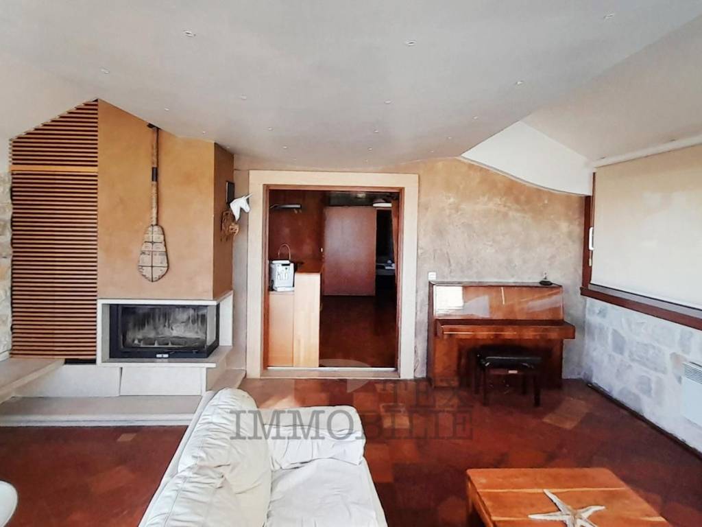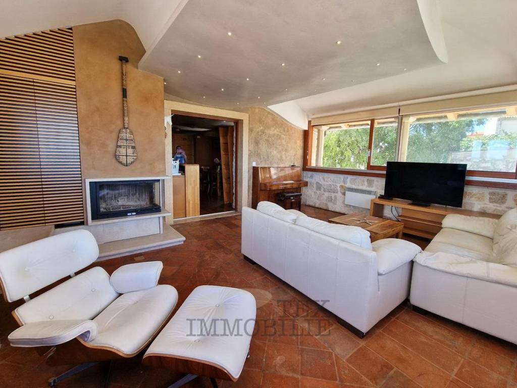 The first floor includes a bedroom, a toilet, a storage room, a kitchen, a dining area, and a living room. The living room boasts a brick floor, a fireplace, and windows facing the sea and the Funtana archipelago, filling the space with natural light and creating a terrace-like feel. The bedroom and dining area are functionally separated using smart partitions, such as cabinets and shelves, for maximum space utilization. Next to the kitchen is a small storage room.