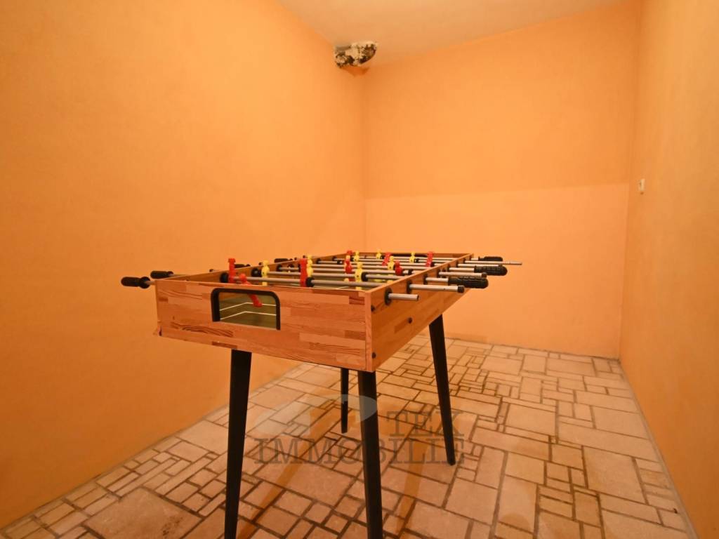 The basement is arranged as a social area with a fireplace and a bar.