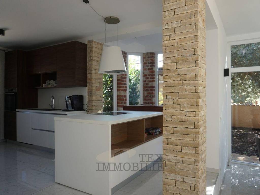 The open kitchen with a kitchen island and integrated bar serves as the centerpiece of family life. The dining area offers a beautiful view of the garden and old olive tree, enhancing the Mediterranean atmosphere.