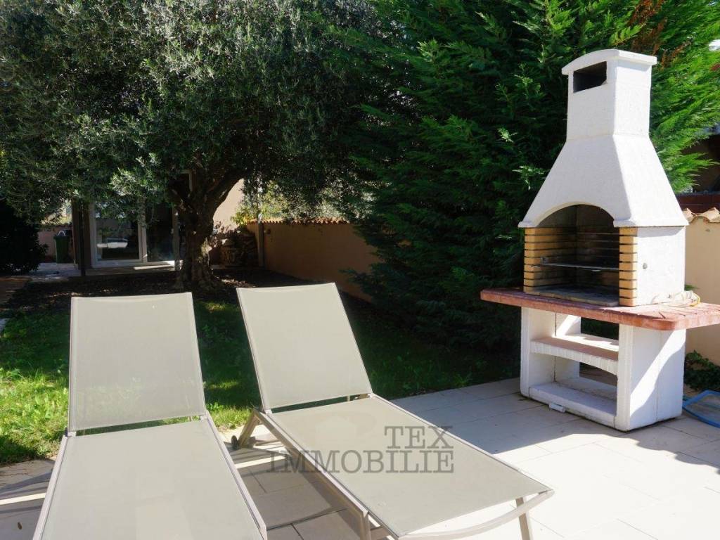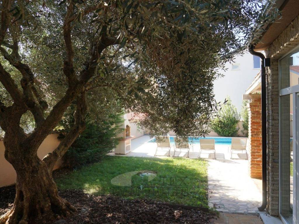 The landscaped garden provides plenty of space for leisure and recreation, featuring a swimming pool with a tiled sun deck, a stone barbecue, and a large covered terrace – perfect for summer gatherings.