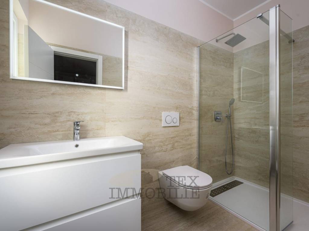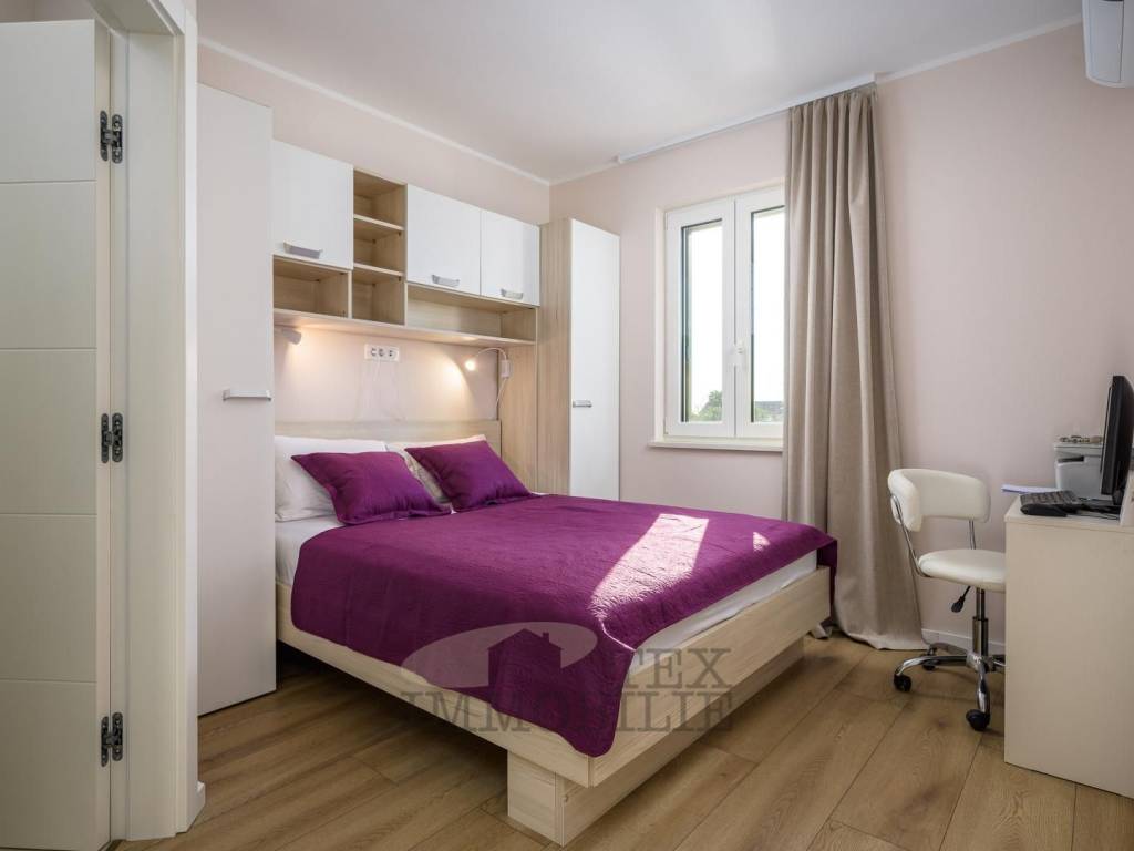 The apartment is located on the first floor and has its own private entrance. It consists of an entrance hall, three bedrooms, three bathrooms, a spacious living room with kitchen and dining area, and a terrace with a sea view.