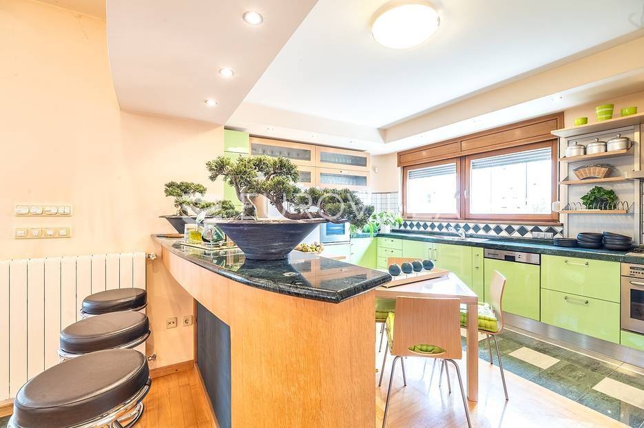 Pantovčak, prekrasna obiteljska vila 850m2 smještena na zemljištu 950m2. Nalazi se na izuzetno mirnoj mikrolokaciji, sa prekrasnim pogledom na zelenilo i grad. U neposrednoj blizini javnog prijevoza, škole i vrtića te svih ostalih bitnijih sadržaja na Britanskom trgu ili centru grada. Vila je sagrađena 2008 god. Izuzetno kvalitetna gradnja, korišteni najbolji materijali. Fasada STO, vanjska stolarija drvo (hrast) sa dvoslojnim staklom, grijači sakupnog žlijeba, grijači stepenica i rampe za automobil, grijanje plin (radijatori), klima kanalna sa 3 vanjske jedinice), žlijeb za prljavi veš, parket egzota, jasen, hrast, kamen, namještaj po mjeri i dizajnerski namještaj, videonadzor (7 kamera), alarm, 3 kamina, bazen prelivni sa 4 reflektora, mlaznicama i pripremom za protustrujno plivanje, vanjska kućica sa roštiljem i krušnom peći, vanjski tuš i toalet. Razvedena u četiri etaže. Razizemlje: garaža za 2 automobila, vešeraj s toaletom, kotlovnica, sauna, kupaonica, dnevni boravak s kuhinjom koji izlazi na natkrivenu terasu i vanjski bazen. Prizemlje: ulazni hall garderoba i wc, open space dnevni boravak s kuhinjom i blagovaonicom, terasa, radna/gostinjska soba s kupaonicom. Kat: master spavaća soba s kupaonicom, garderobom i terasom, odvojen dječji spavaći dio sa 3 spavaće sobe i kupaonicom. 2 kat: odvojen komforan trosoban stan 185m2 sa velikom terasom i panoramskim pogledom na grad. Ovaj stan ima odvojena brojila plina i struje. Ostale informacije na upit.