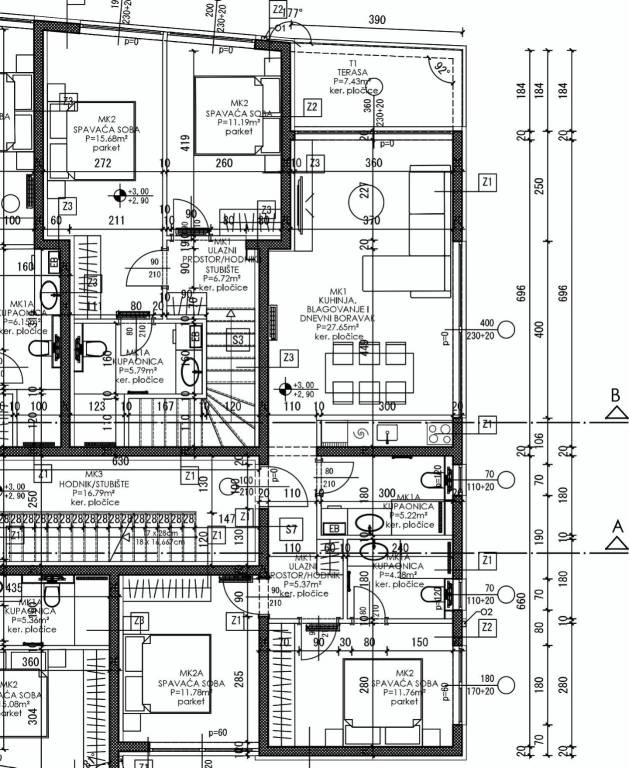 Apartment S-07 – 1st floor – residential area 66.06 m² (2 bedrooms + 2 bathrooms) + loggia (7.44 m² x 0.75 = 5.58 m²) + outdoor parking space PM7 (12.50 m² x 0.2 = 2.5 m²); net calculated area 74.14 m² = 398,502 EUR
